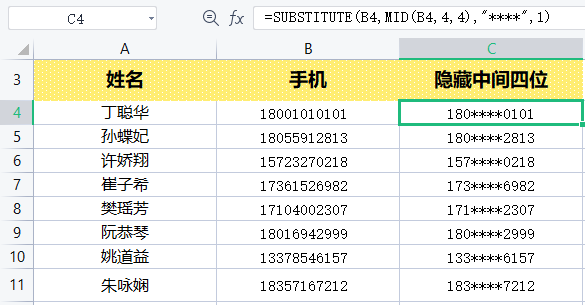 如下图所示,要将手机号码的中间四位换成星号,公式为: