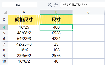 如下图,要计算单元格中的文本算式,直接使用函数= EVALUATE(A4)