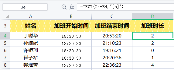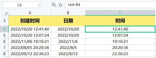 要继续提取时间,只需要做个减法=A4-B4,就欧了: