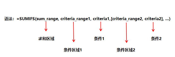 =SUMIFS(求和区域, 条件区域1, 条件1, [条件区域2, 条件2], ...)