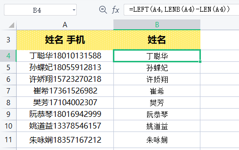 如下图,要从A列姓名手机中提取出姓名,除了使用高版本的自动填充功能(CTRL+E),还可以使用公式完成: