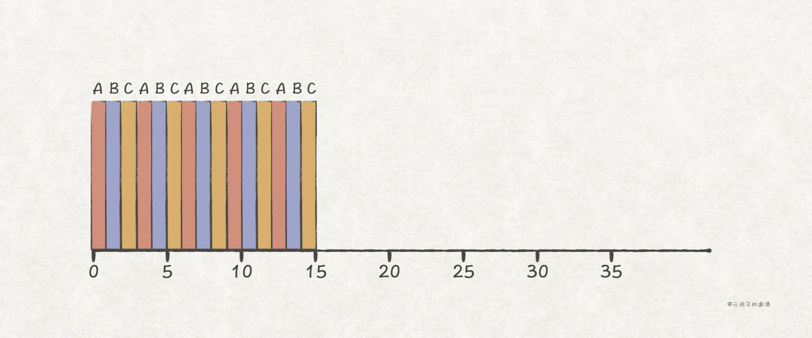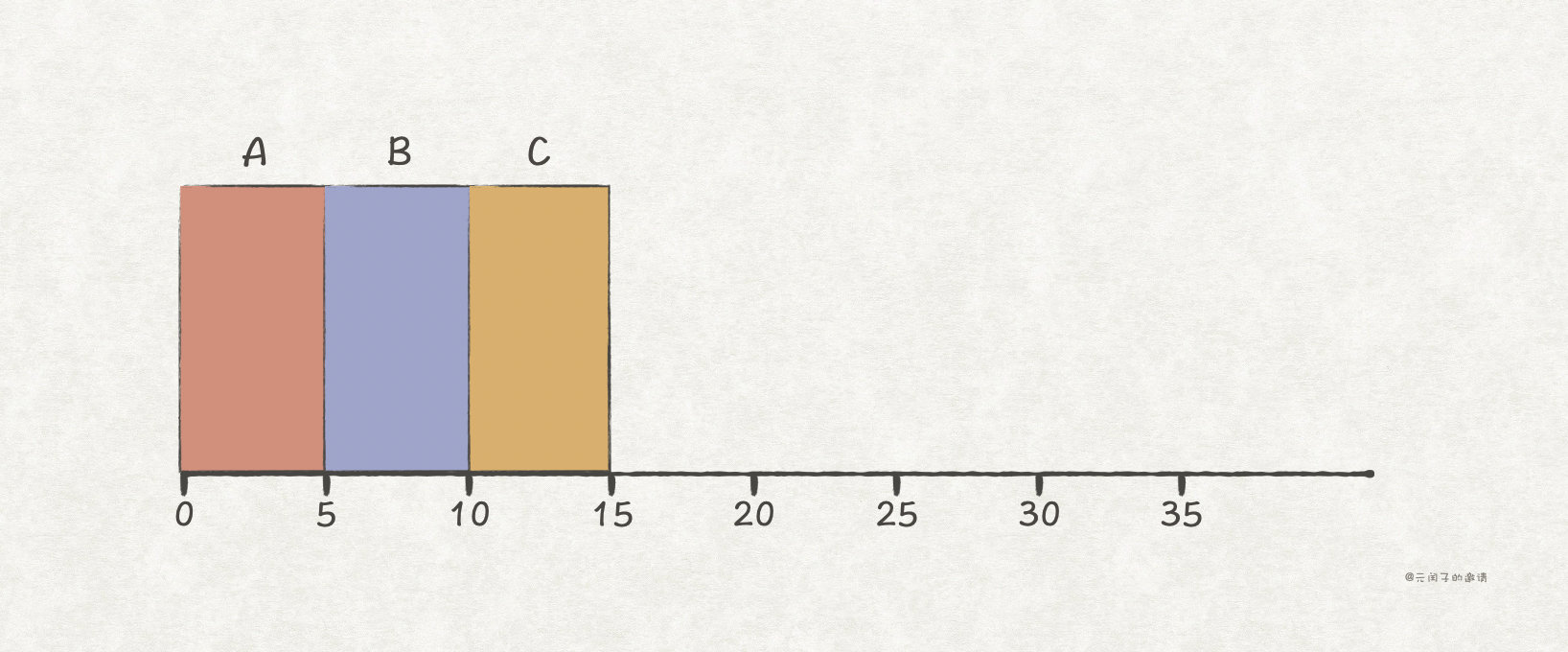 不妨假设A、B、C三个任务都在t=0时刻到达,运行时长都是5s,那么这三个算法的调度情况如下,平均响应时长为5s( 0 + ( 5 − 0 ) + ( 10 − 0 ) 3 \frac {0+(5-0)+(10-0)}{3} 30+(5−0)+(10−0)):