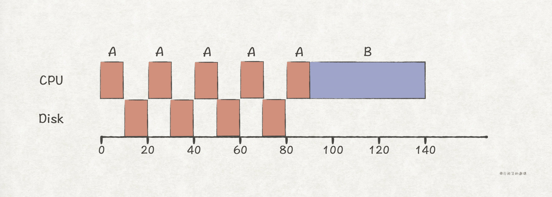 到目前为止,我们并未考虑任何的I/O操作。我们知道,当触发I/O操作时,进程并不会占用CPU,而是阻塞等待I/O操作的完成。现在让我们打破假设4,考虑任务A和B都在t=0时刻到达,运行时长都是50ms,但A每隔10ms执行一次阻塞10ms的I/O操作,而B没有I/O。
