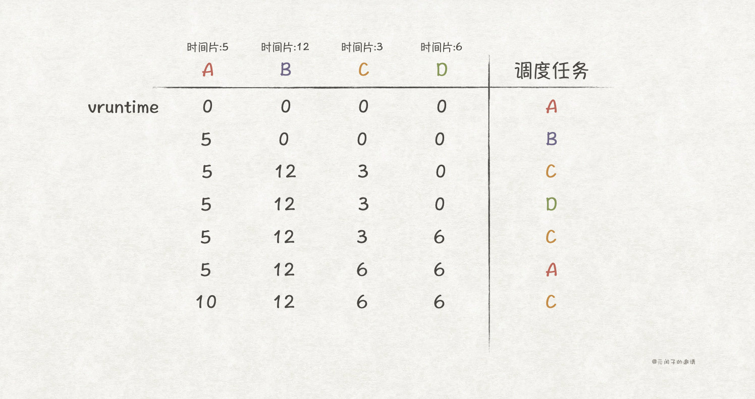 CFS给每个任务都维护一个vruntime值,每当任务被调度之后,就累加它的vruntime。比如,当任务A运行了5ms的时间片之后,则更新为vruntime += 5ms。CFS在下次调度时,选择vruntime值最小的任务来调度,比如: