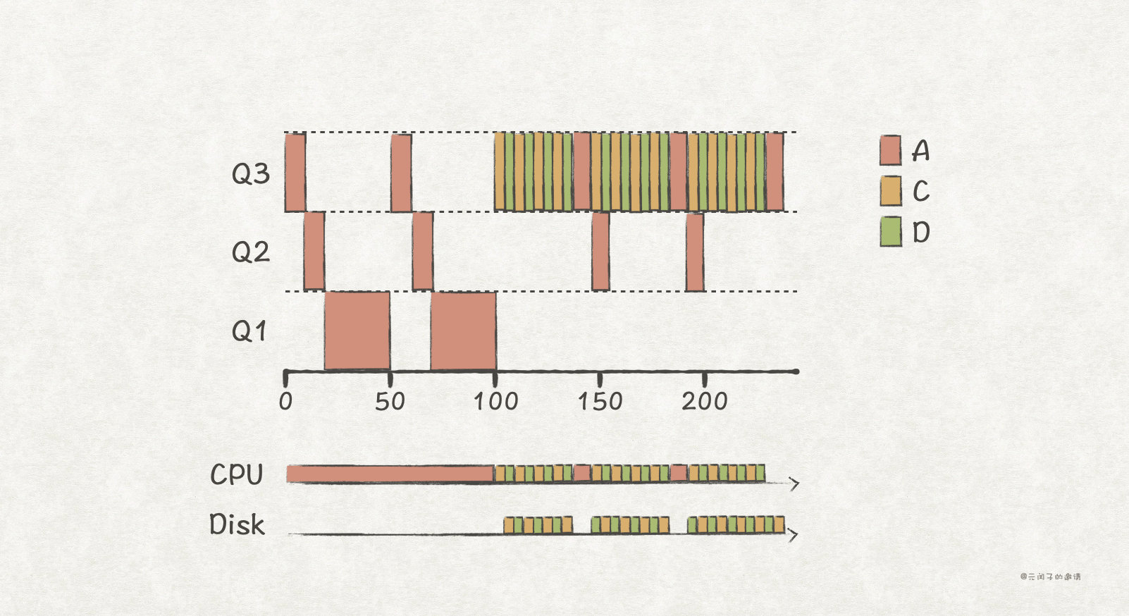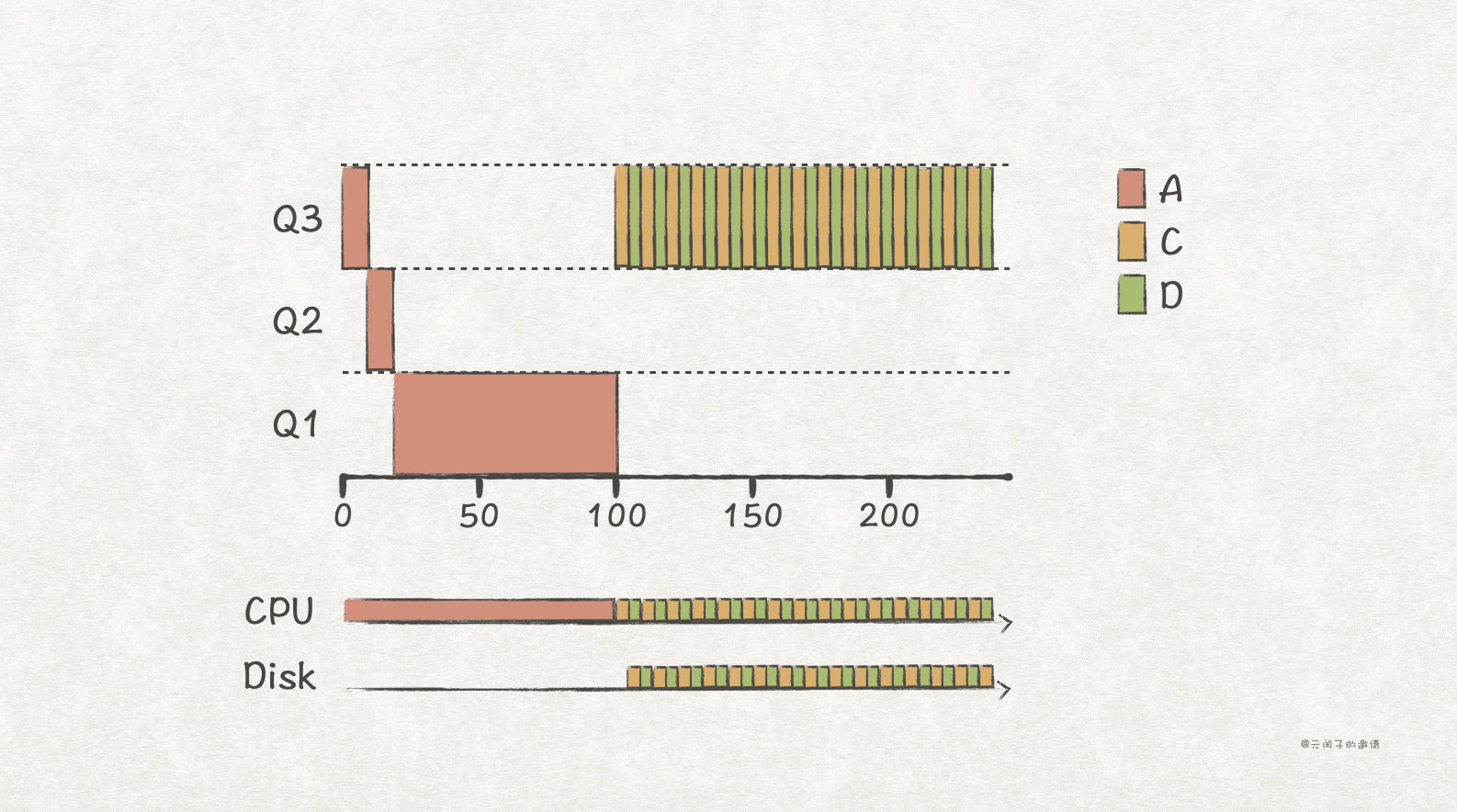 考虑如下场景,任务A运行到t=100时,交互类任务C和D同时到达,那么调度情况会是这样的: