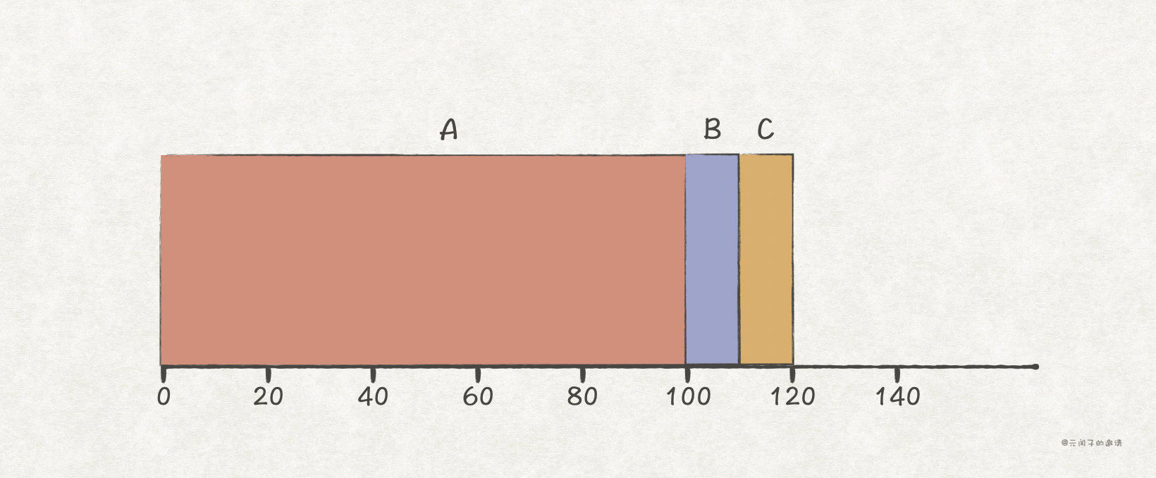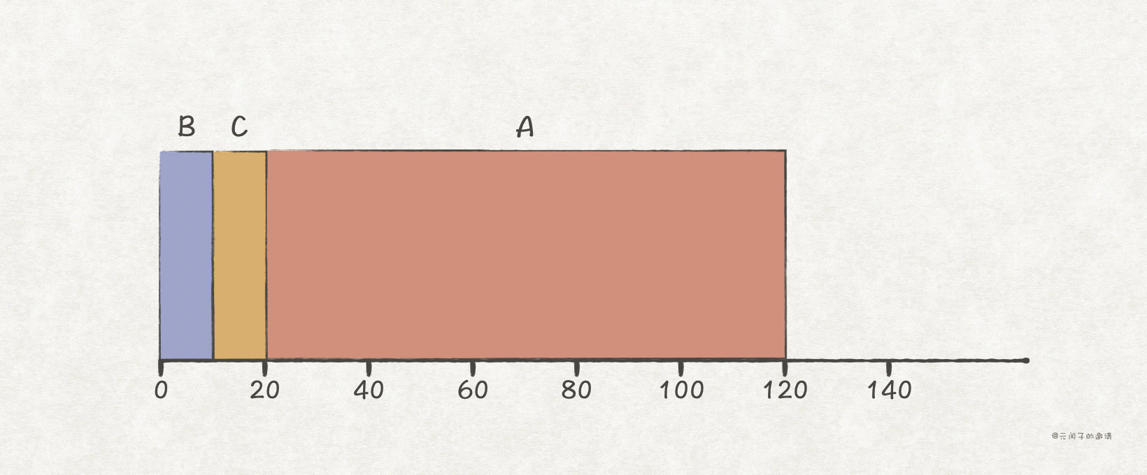 然而现实总是残酷的,如果假设1被打破,比如A的运行时间变成100s,B和C的还是10s,那么调度情况是这样的: