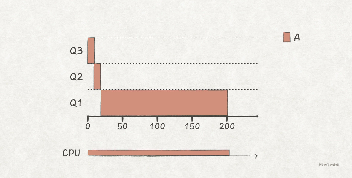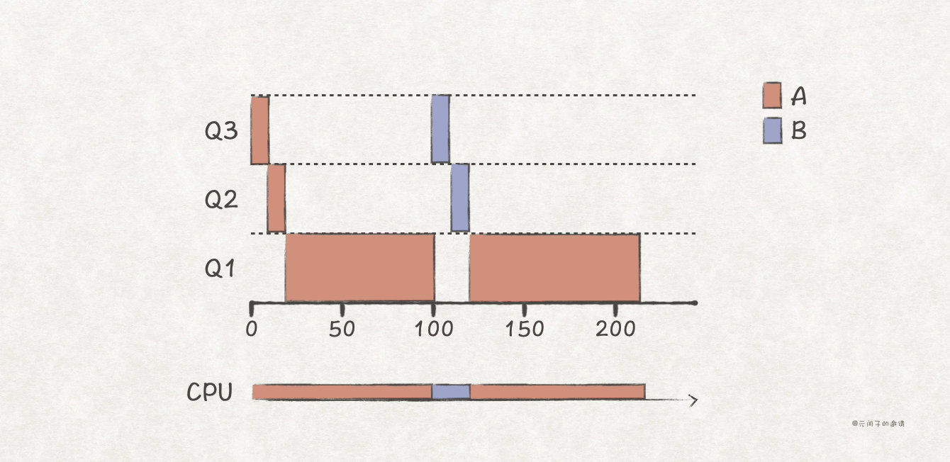 - 规则4a:如果任务A运行了一个时间片都没有主动让出CPU(比如I/O操作),则优先级降低一级