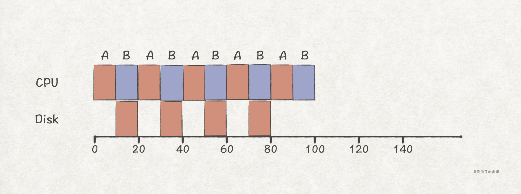 要解决该问题,只需使用RR的调度算法,给任务A和B分配10ms的时间片,这样当A阻塞在I/O操作时,就可以调度B,而B用完时间片后,恰好A也从I/O阻塞中返回,以此类推,调度总时长优化至100ms。