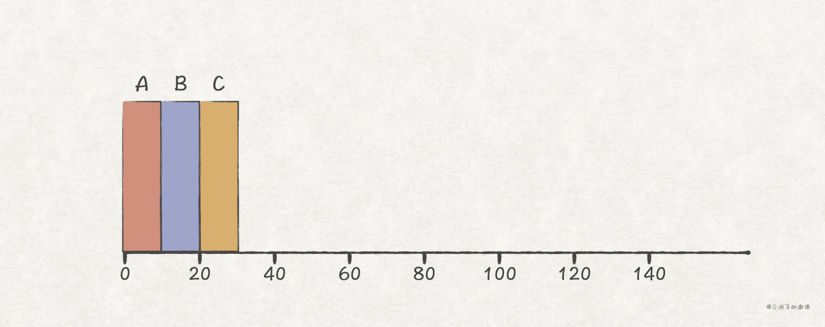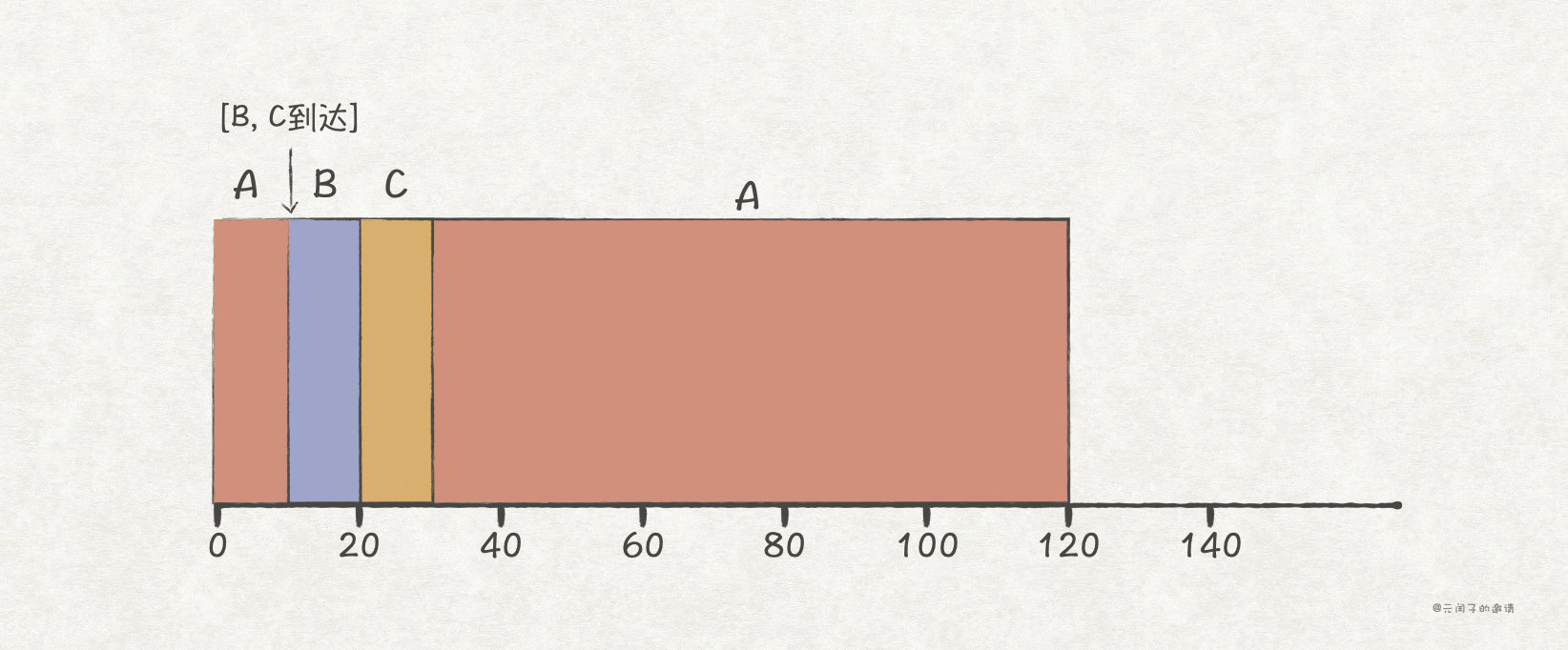 让我们继续打破假设2,A在t=0时刻,B和C则在t=10时刻到达,那么调度情况会变成这样:
