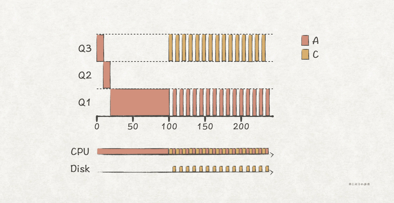 MLFQ会在任务处于阻塞时按照优先级选择其他任务运行,避免CPU空转。因此,在上图中,当任务C处于I/O阻塞状态时,任务A得到了运行时间片,当任务C从I/O阻塞上返回时,A再次挂起,以此类推。另外,因为任务C在时间片之内出现主动让出CPU的行为,C的优先级一直保持不变,这对于交互类任务而言,有效提升了用户体验。