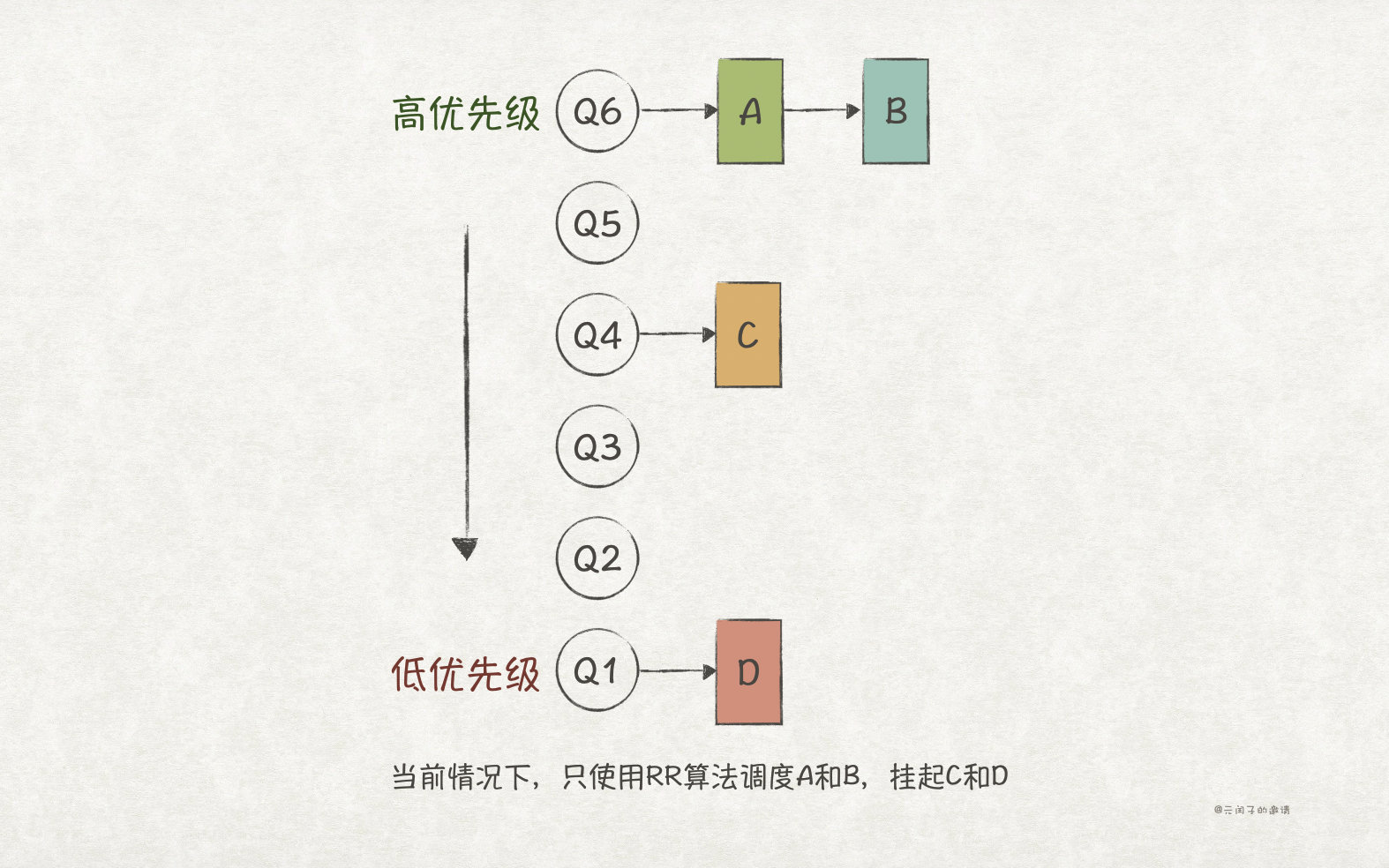 MLFQ与前文介绍的几种调度算法最显著的特点就是新增了优先级队列存放不同优先级的任务,并定下了如下两个规则: