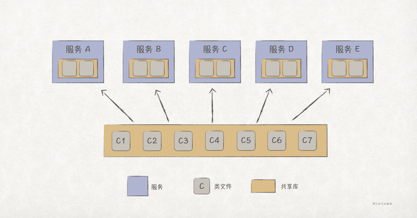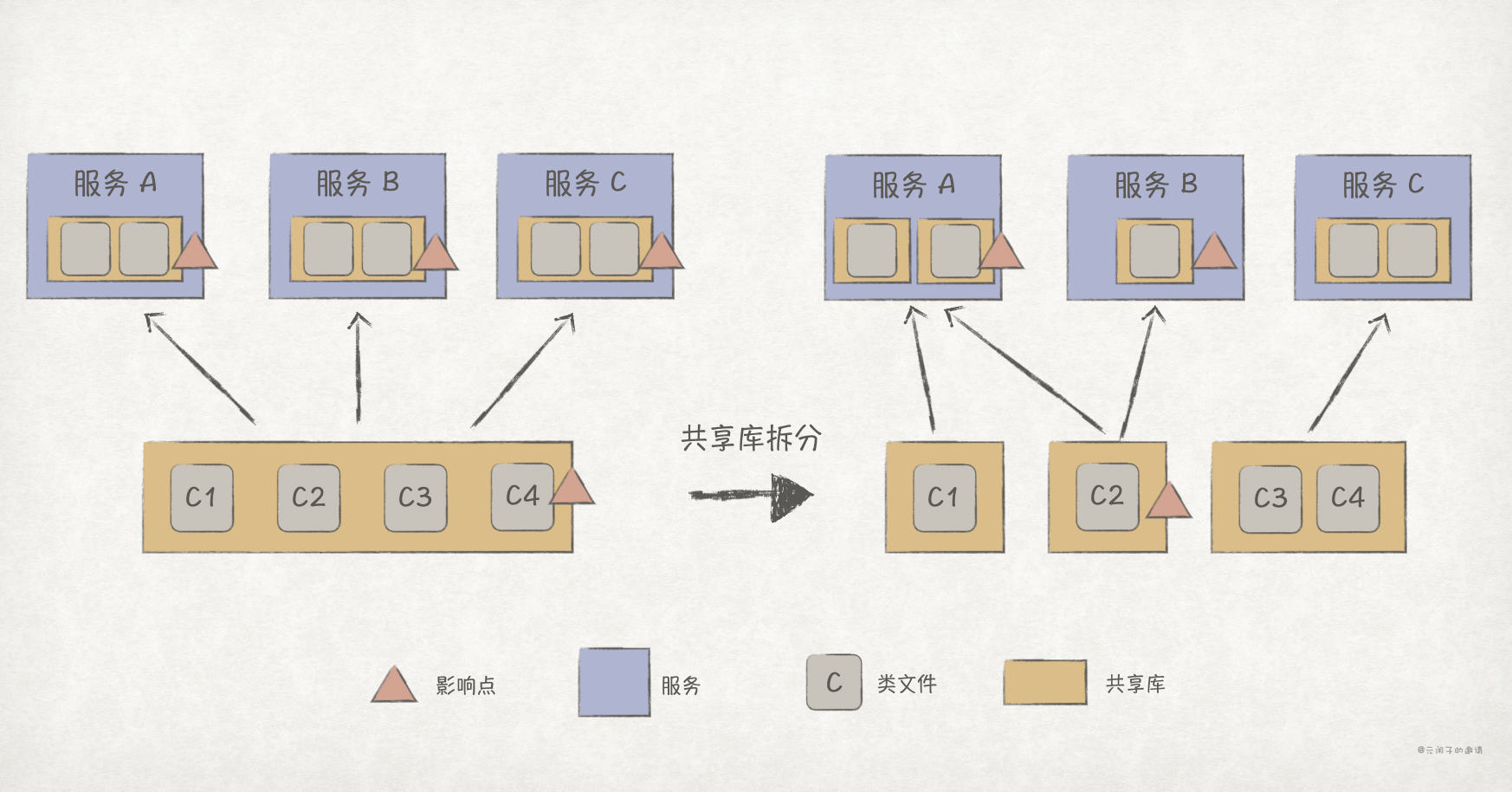 根据每个服务依赖的类文件的不同,我们可以将粗粒度的共享库拆分,避免不必要的耦合出现。