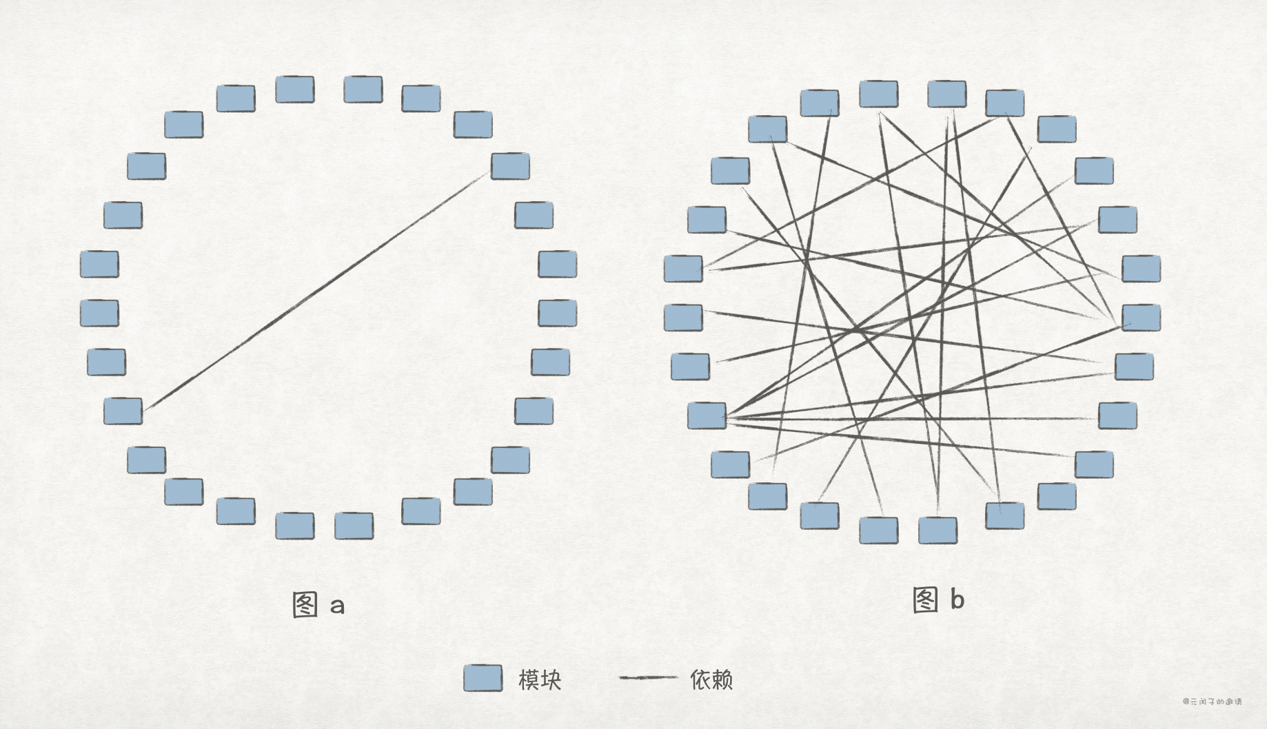 比如,在下图 a 中的依赖关系下,拆分是低代价的,可能只须进行简单的代码重构,就能顺利地完成拆分;而在图 b 的依赖关系下,拆分的代价变得高昂,须要对代码进行大规模的重写,才可能完成拆分。