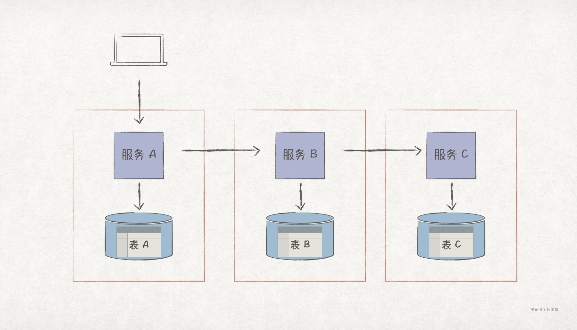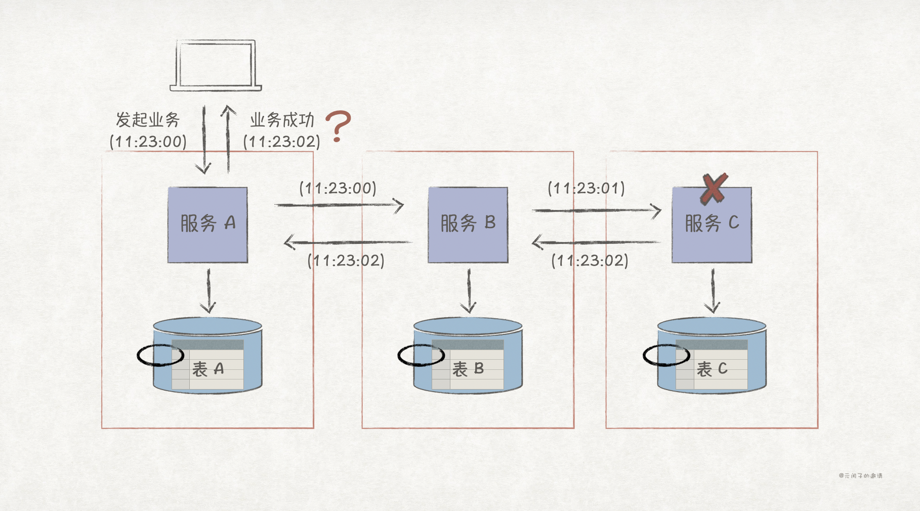 2、服务间同步通信。服务间采用同步通信方式,就能实现在业务流程结束后达成最终一致性。同步通信的最大缺点是,当服务 C 故障时,整个系统将处于不可用状态,表现为用户得不到正常响应。