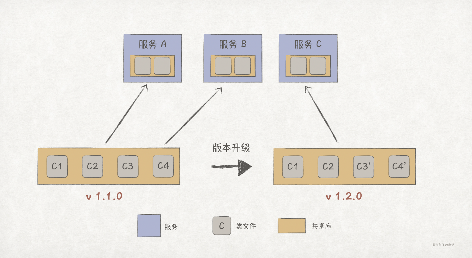 另外,我们也可以通过版本管理来控制共享库的影响范围。比如,服务 C 需要类文件 C3 和 C4 升级功能,而服务 A 和 B 并不需要,我们可以给共享库进行版本升级,只需服务 C 更新依赖版本即可。
