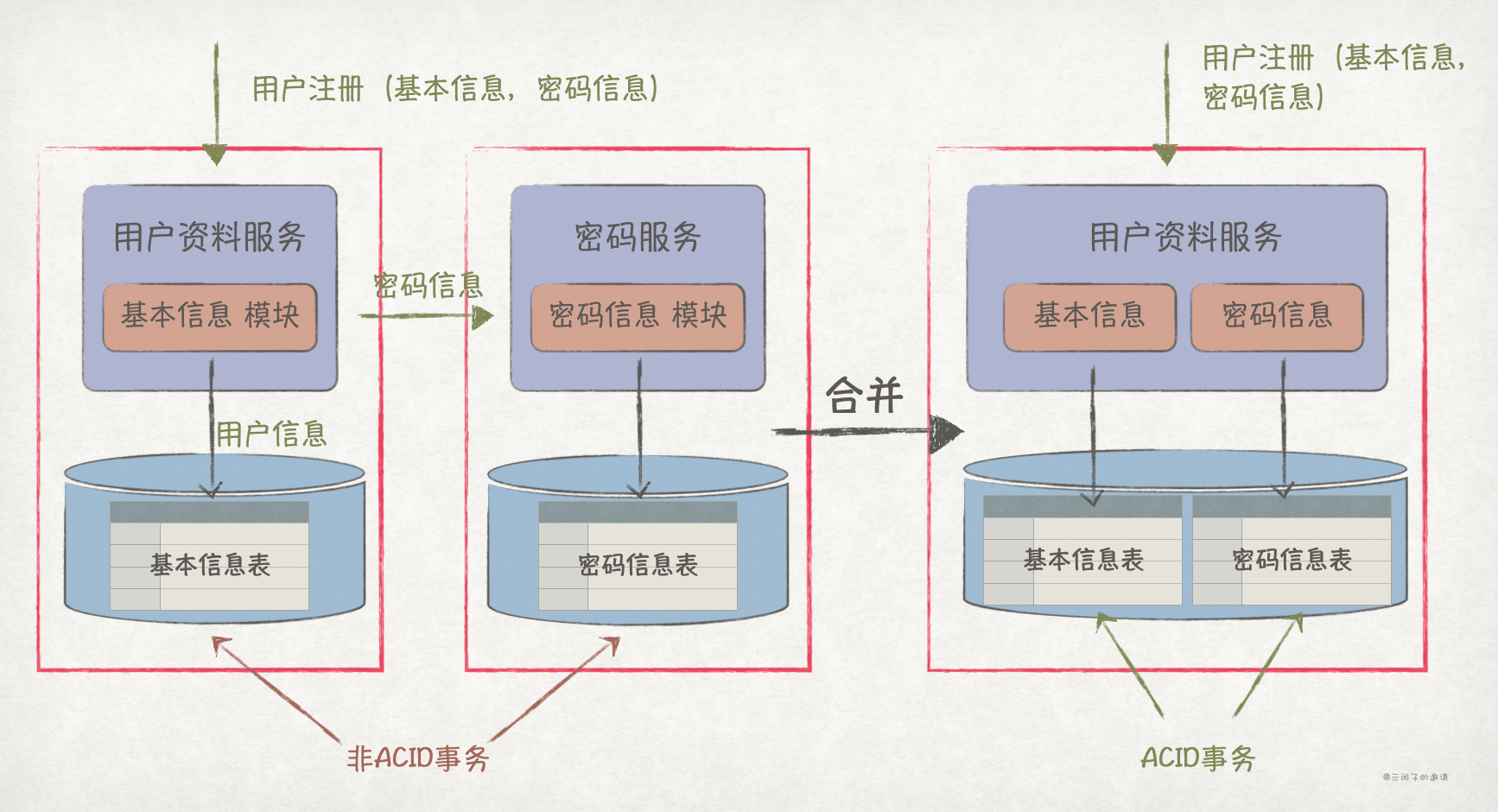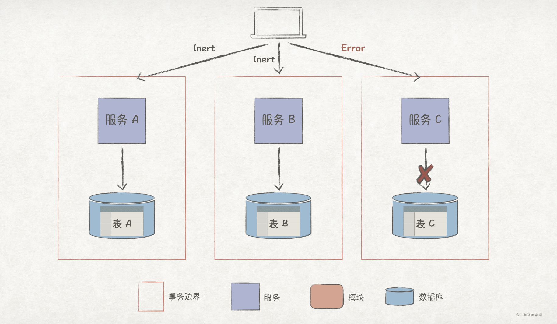 在单体架构或多个服务共享一个数据库的服务化架构之下,我们可以利用数据库的能力实现 ACID 事务。比如在下图中,在一个 ACID 事务内有三次 Insert,当最后一次失败时,数据库会将两次的 Insert 操作回滚。
