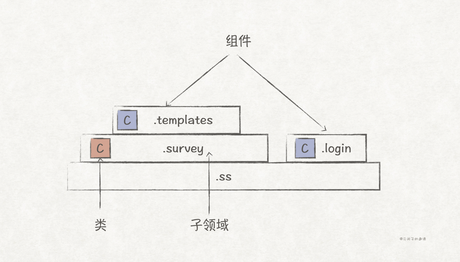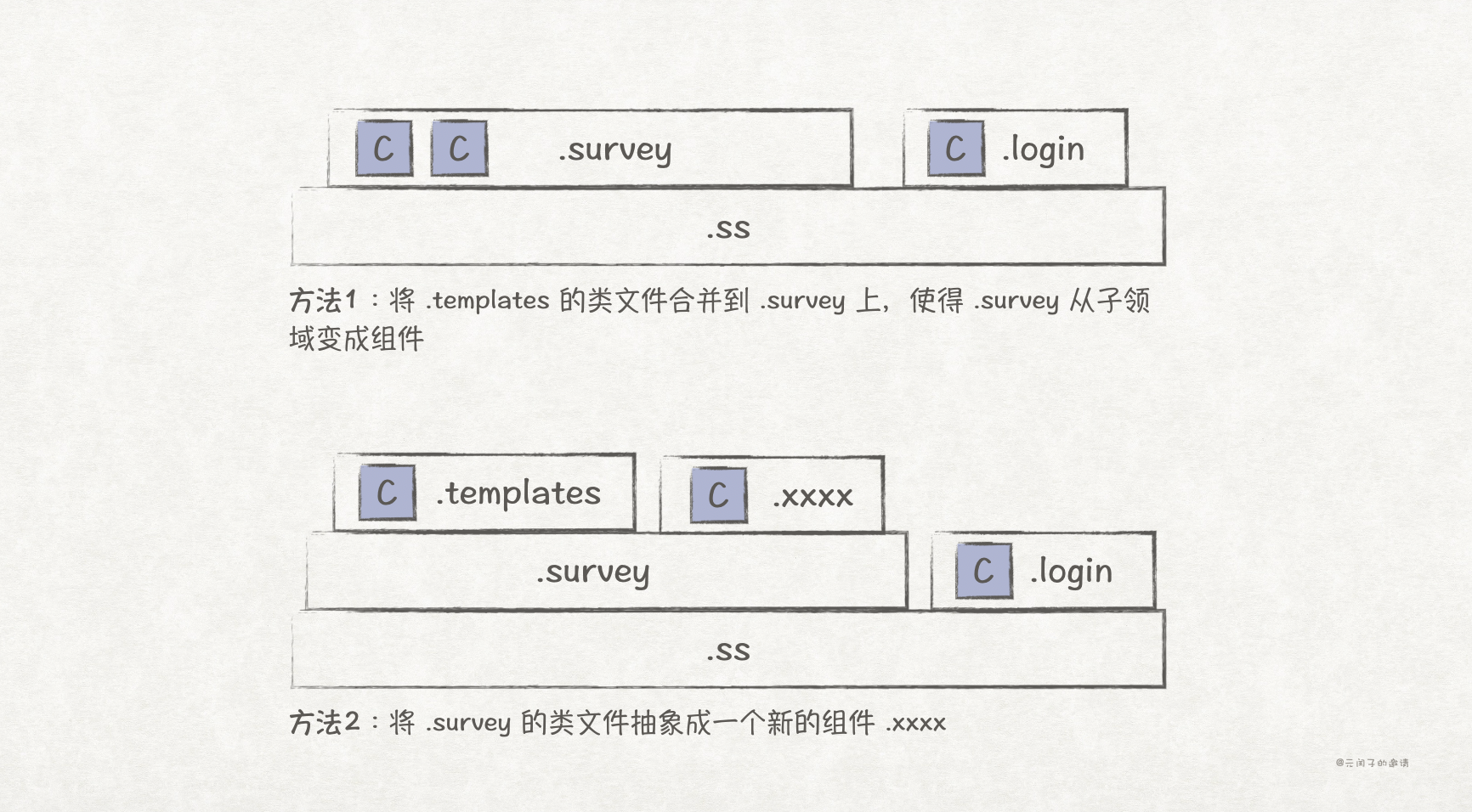 针对这种方向,我们有 2 种扁平化解决方案。(1)将 .templates 组件合并到 .survery 组件下;(2)将 .survery 子领域下的类文件抽象成新的组件。