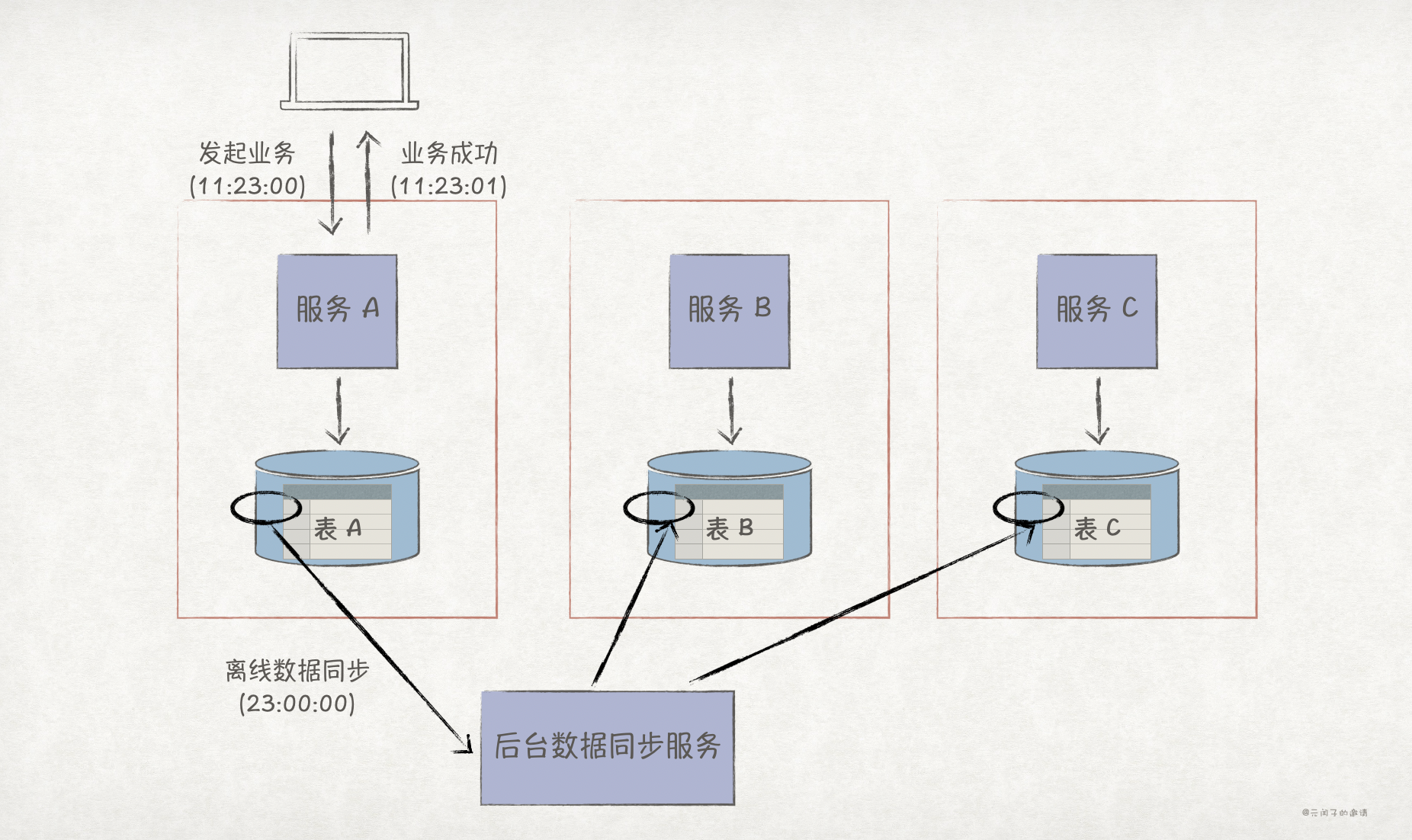 | 数据离线同步通常发生在深夜业务空闲间隙,从而导致实现最终一致性的时间很长 |