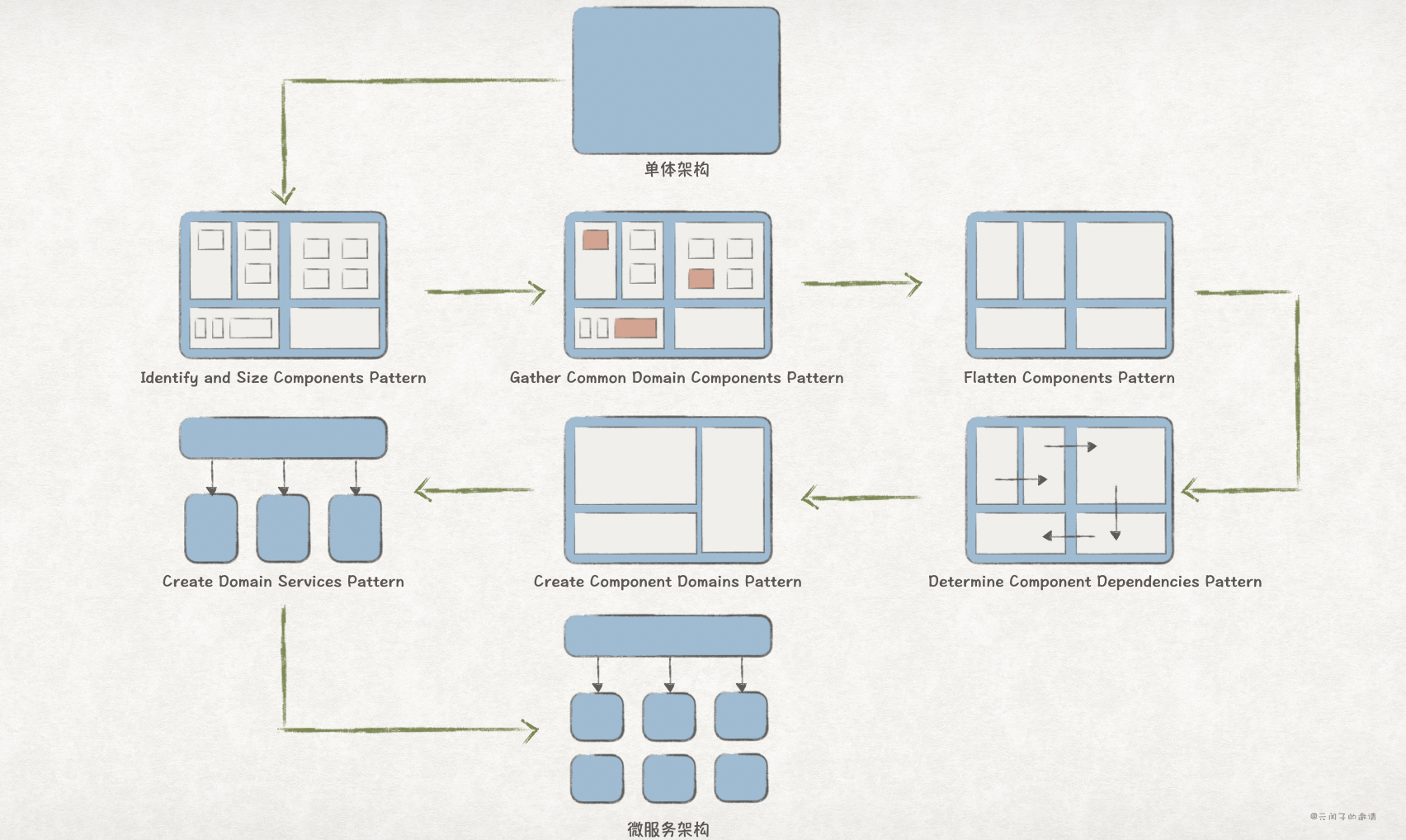 基于组件进行服务拆分可以分成 6 步走,书中把每一步总结成一个模式,整体的 roadmap 如下: