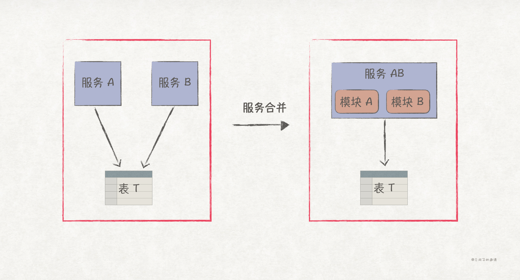 微服务架构是典型的分布式架构,但分布式架构的架构量子并不一定都为 n,比如服务化架构,虽然有多个服务,但它们依赖同一数据库。现假设服务 A 对数据表做了升级,因而重新部署;那么依赖同一张表的服务 B 也因适配新数据表而重新部署。所以,服务 A 和 服务 B 并不具备独立部署的性质,如下图所示:
