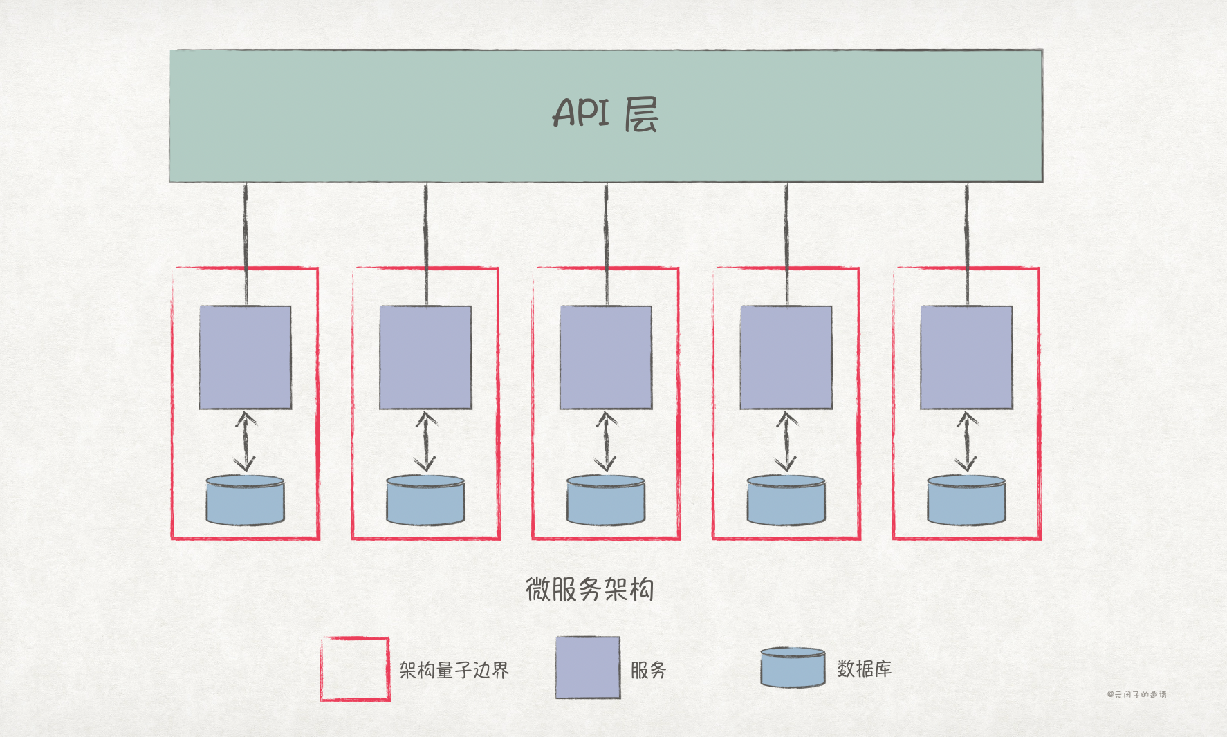 另一个典型,微服务架构的架构量子数量为 n,其中 n 为微服务数量,如下图所示: