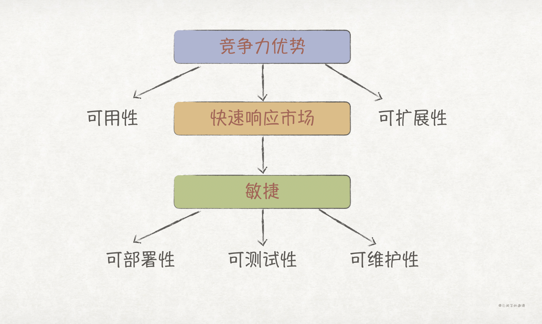 清晰的业务述求是拆分的唯一驱动力,好的软件,必然是敏捷的、能够快速响应市场需求、具备竞争力的优势,映射到软件架构语言上,主要是软件的可维护性(Maintainability)、可测试性(Testability)、可部署性(Deployability)、可扩展性(Scalability)和可用性(Availability)。