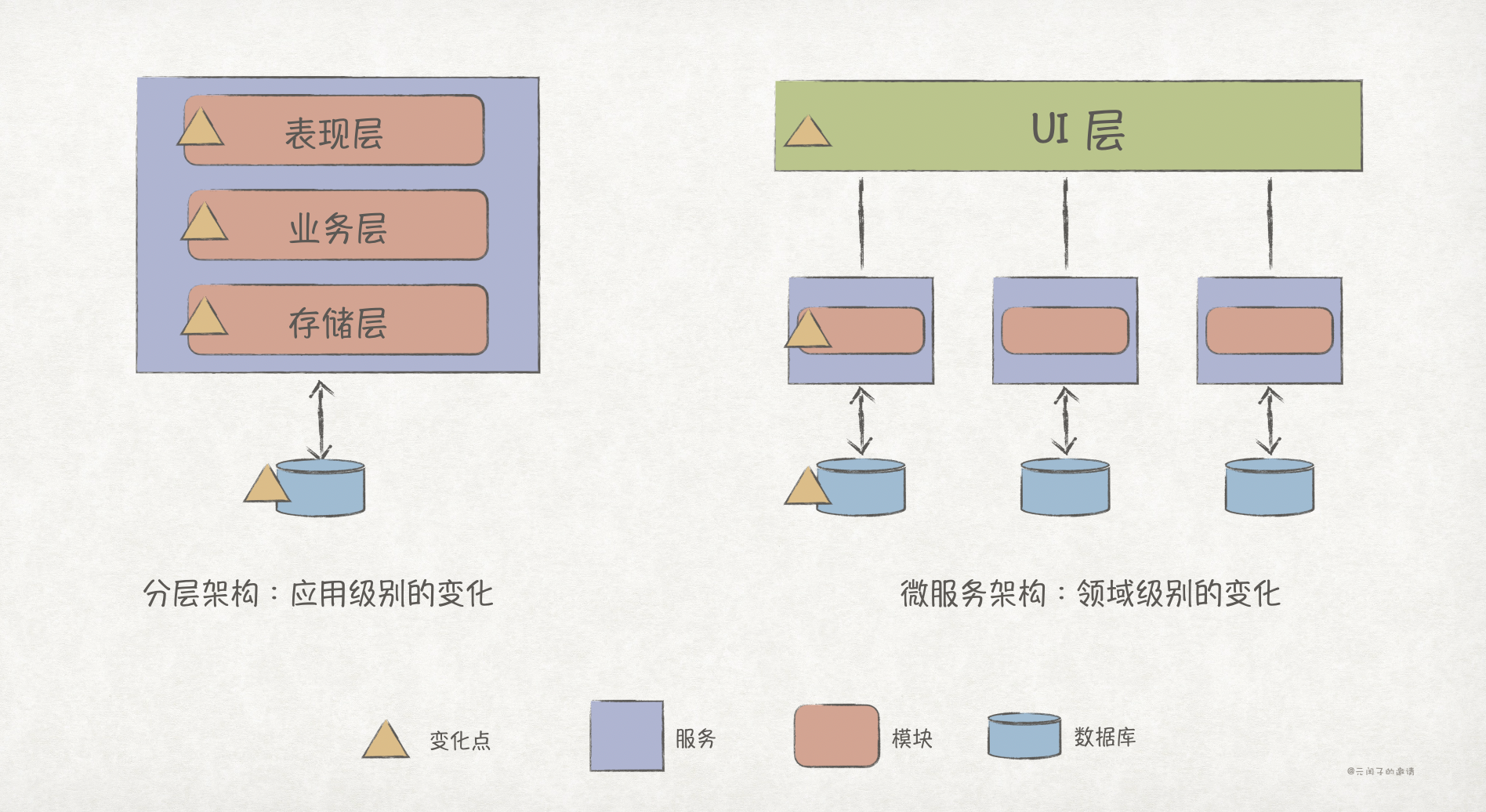 第二,软件架构是稳定的。Hard 取自于硬件的英文单词 Hardware,相比软件 Software,硬件是更稳定的一个,它是软件的基础。同理,软件架构是一款软件的架子、基础,好的架构通常都是稳定的,不轻易随软件的变更而变化。