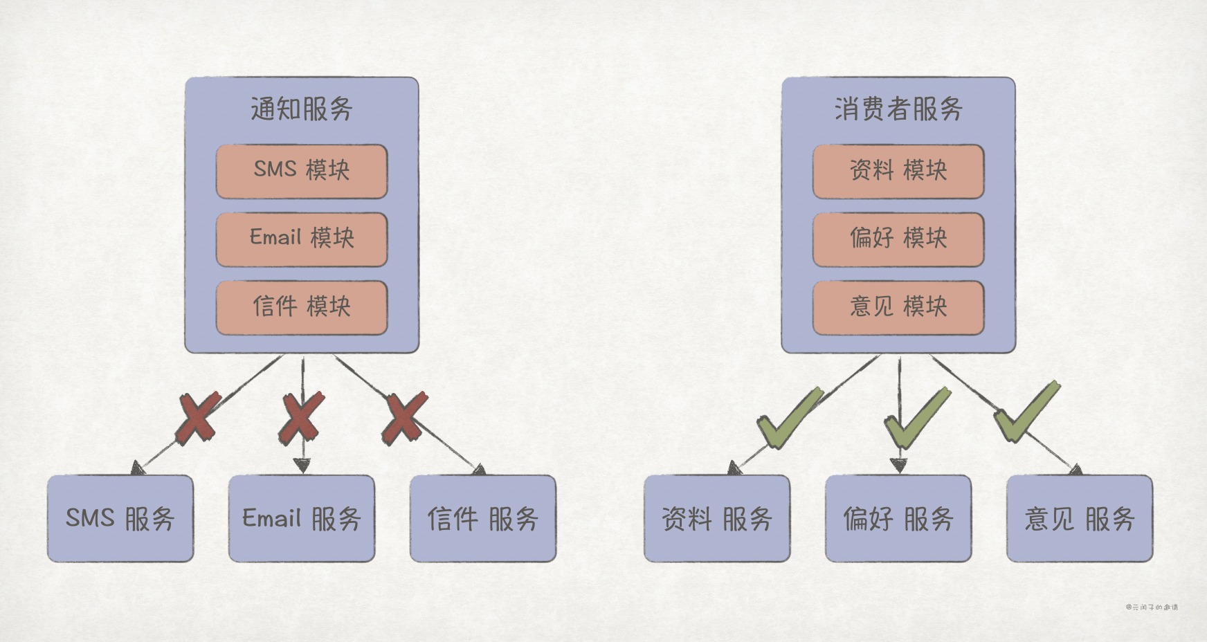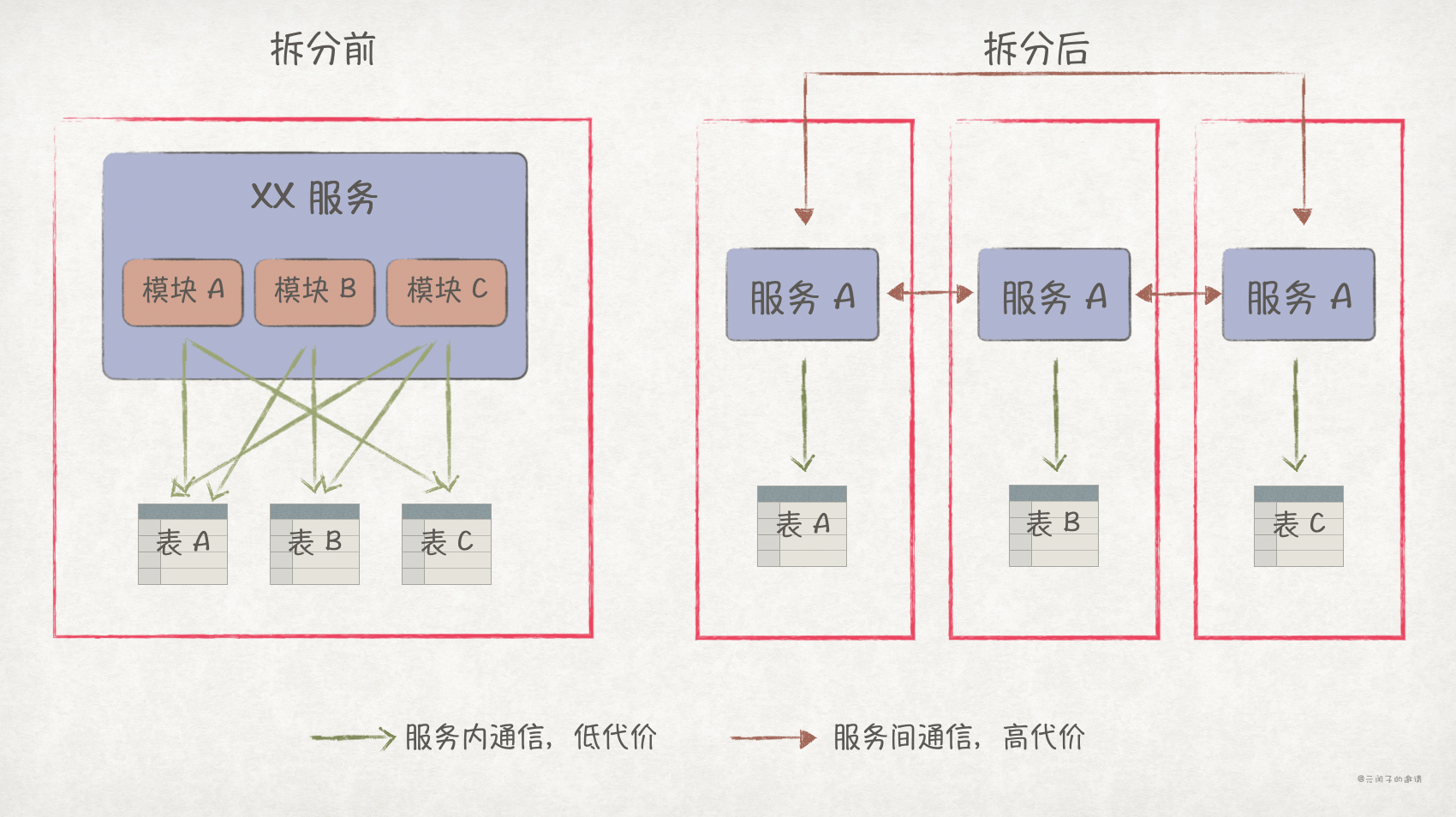 | 完全不存在代码重复。 | 功能的使用,从服务内接口调用变成服务间接口调用,网络时延影响系统性能。 |