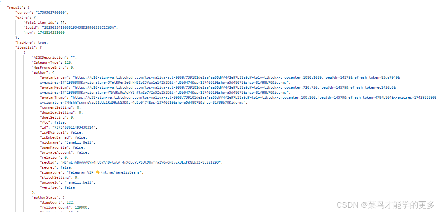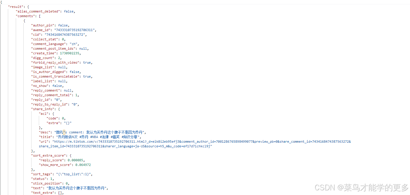 参数 说明 token 鉴权参数 aweme_id 视频id cursor 翻页参数,从上一页获取,默认为空返回第一页数据 -