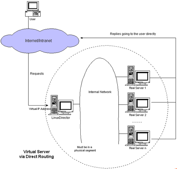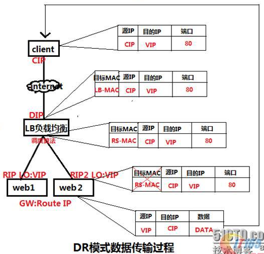 度器LB与真实服务器RS都有一块网卡连接到同一物理网段上,必须在同一个局域网环境。DR模式是互联网使用比较多的一种模式。