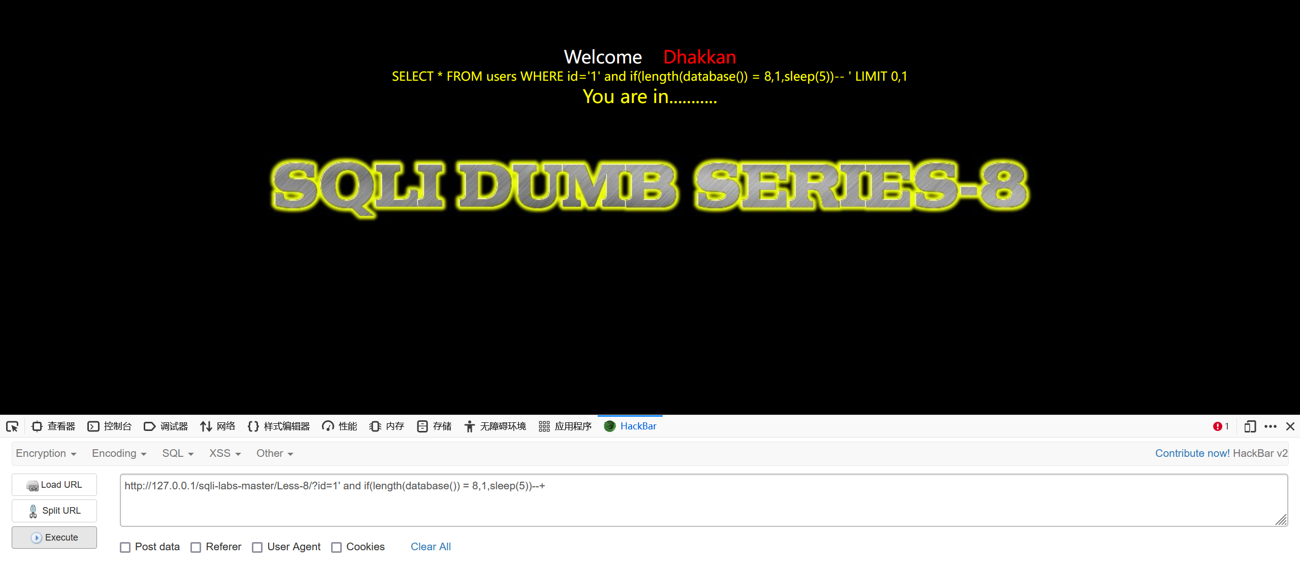 输入 http://127.0.0.1/sqli/Less-9/?id=1' and if(length(database())=8,1,sleep(5))--+