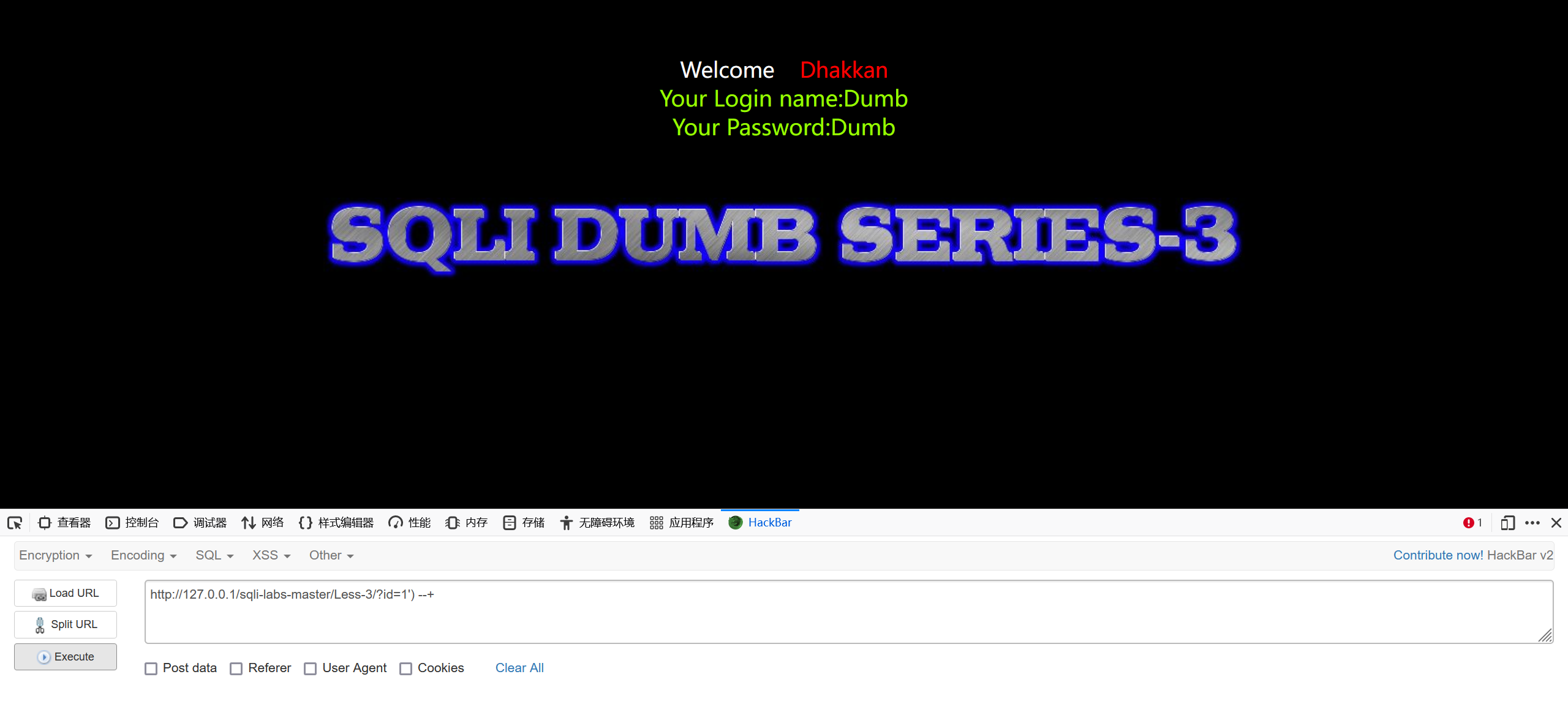 同第一关输入http://127.0.0.1/sqli-labs-master/Less-3/?id=1'