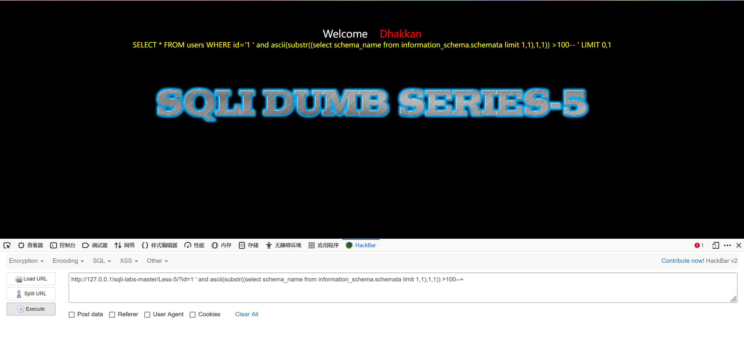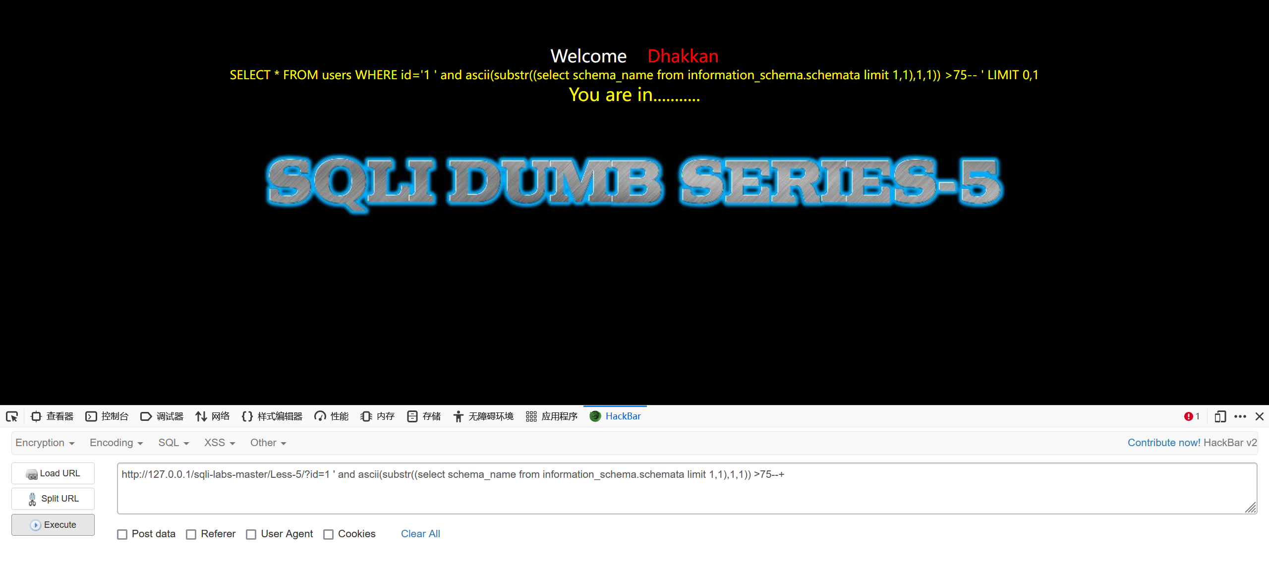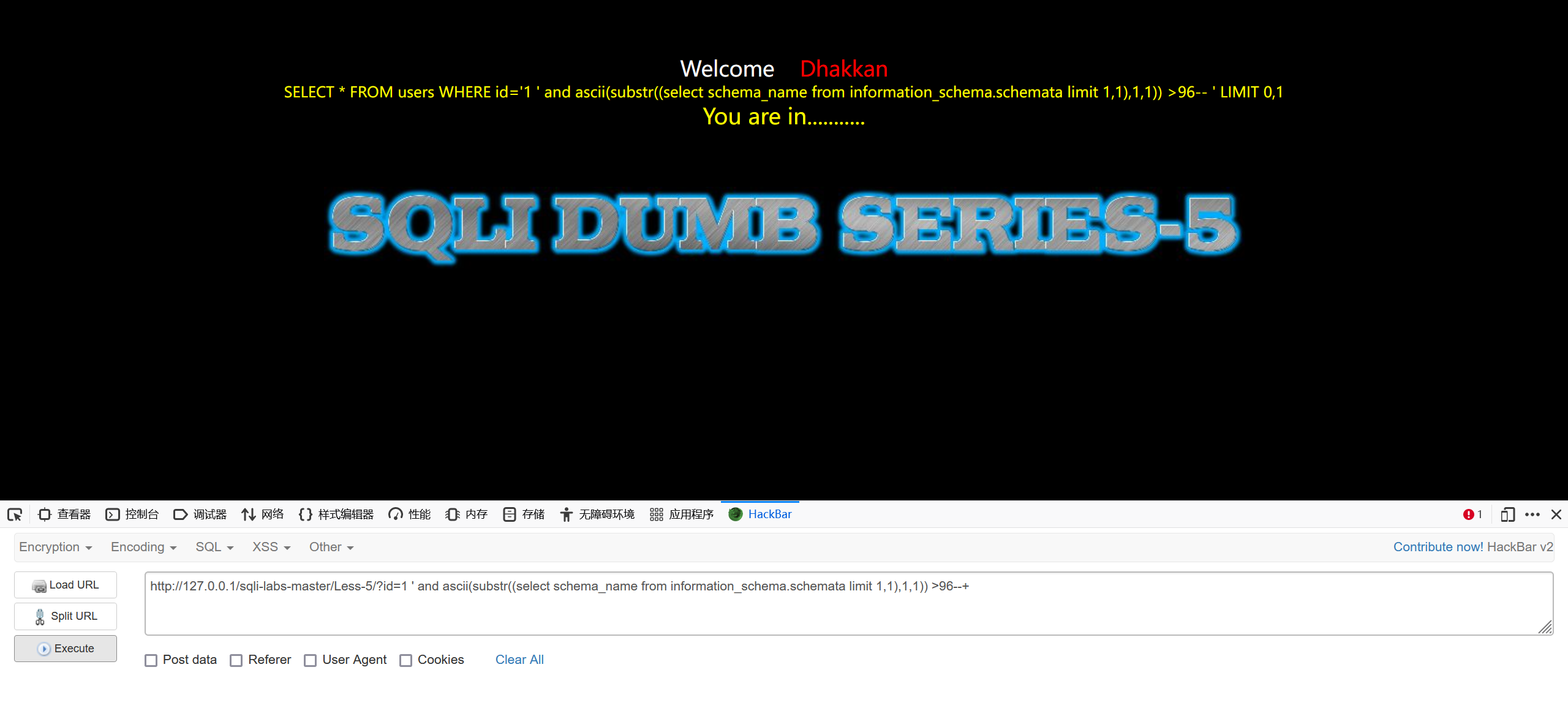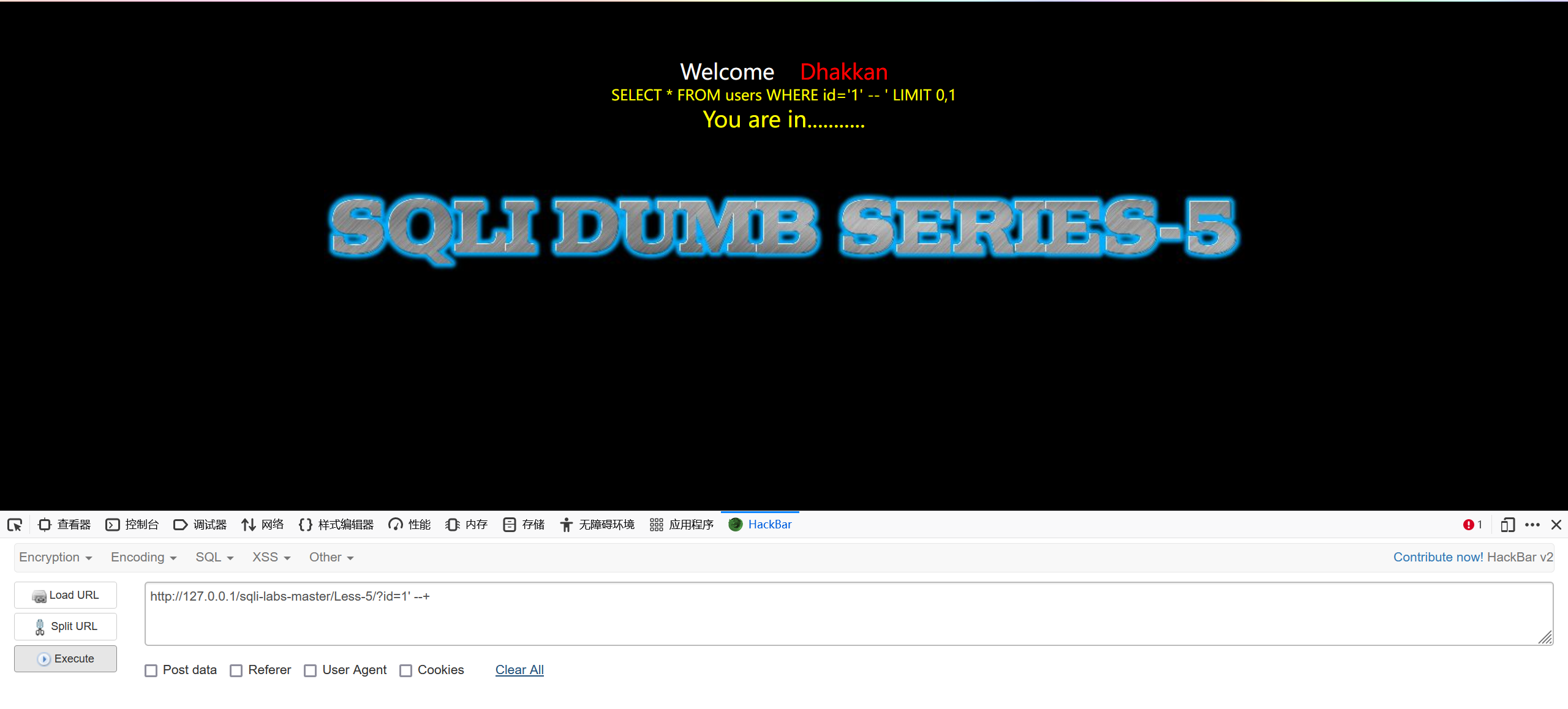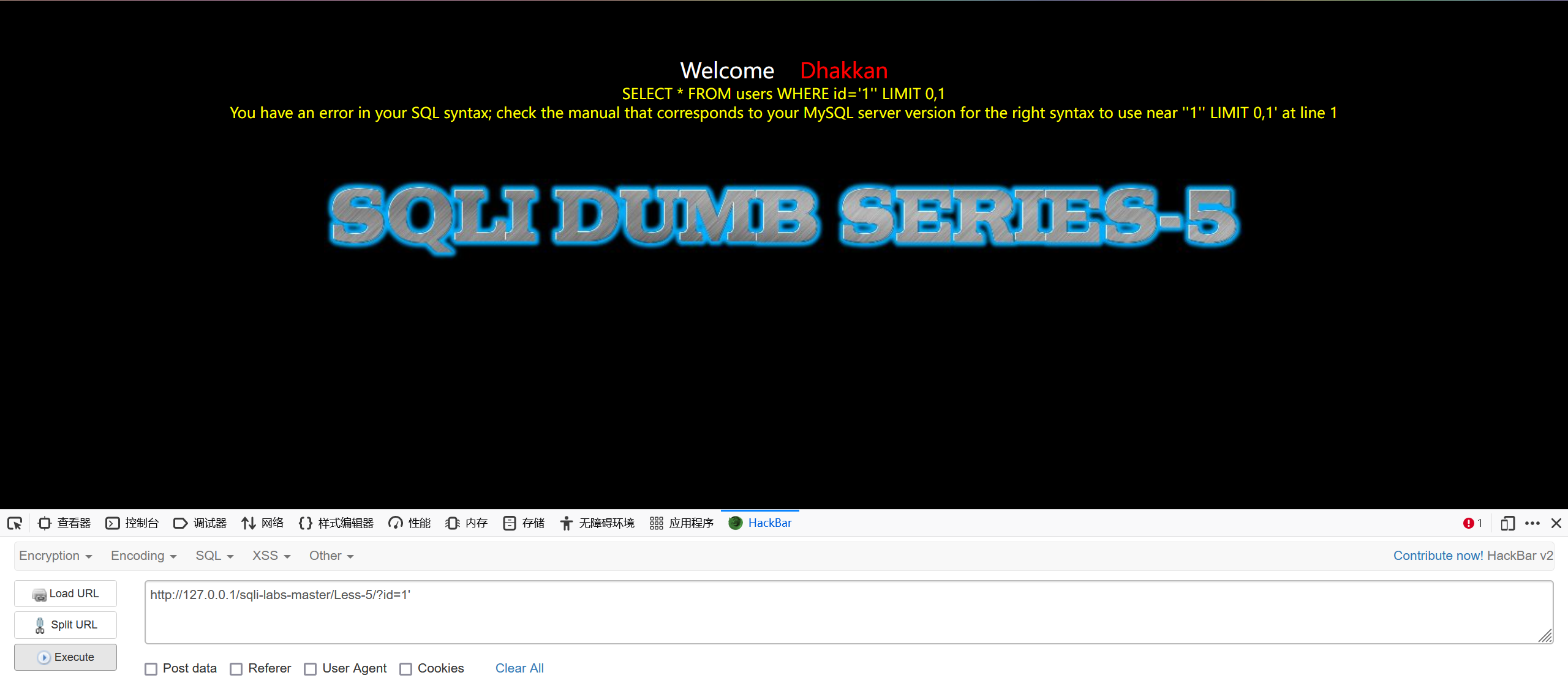 根据提示可输入:http://127.0.0.1/sqli-labs-master/Less-5/?id=1‘--+