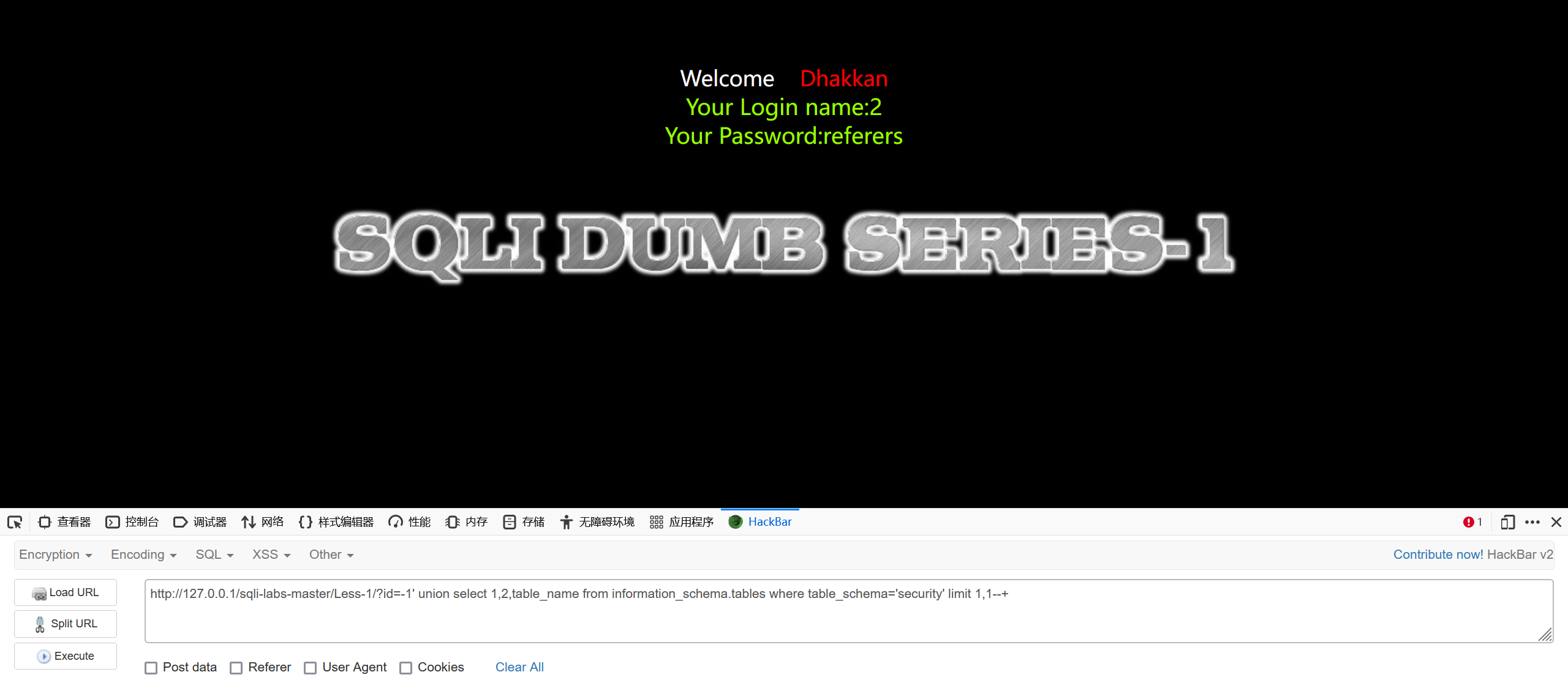 5.输入http://127.0.0.1/sqli-labs-master/Less-1/?id=-1' union select 1,2,table_name from information_schema.tables where table_schema='security' limit 1,1--+查看位于security库下的第一个表: