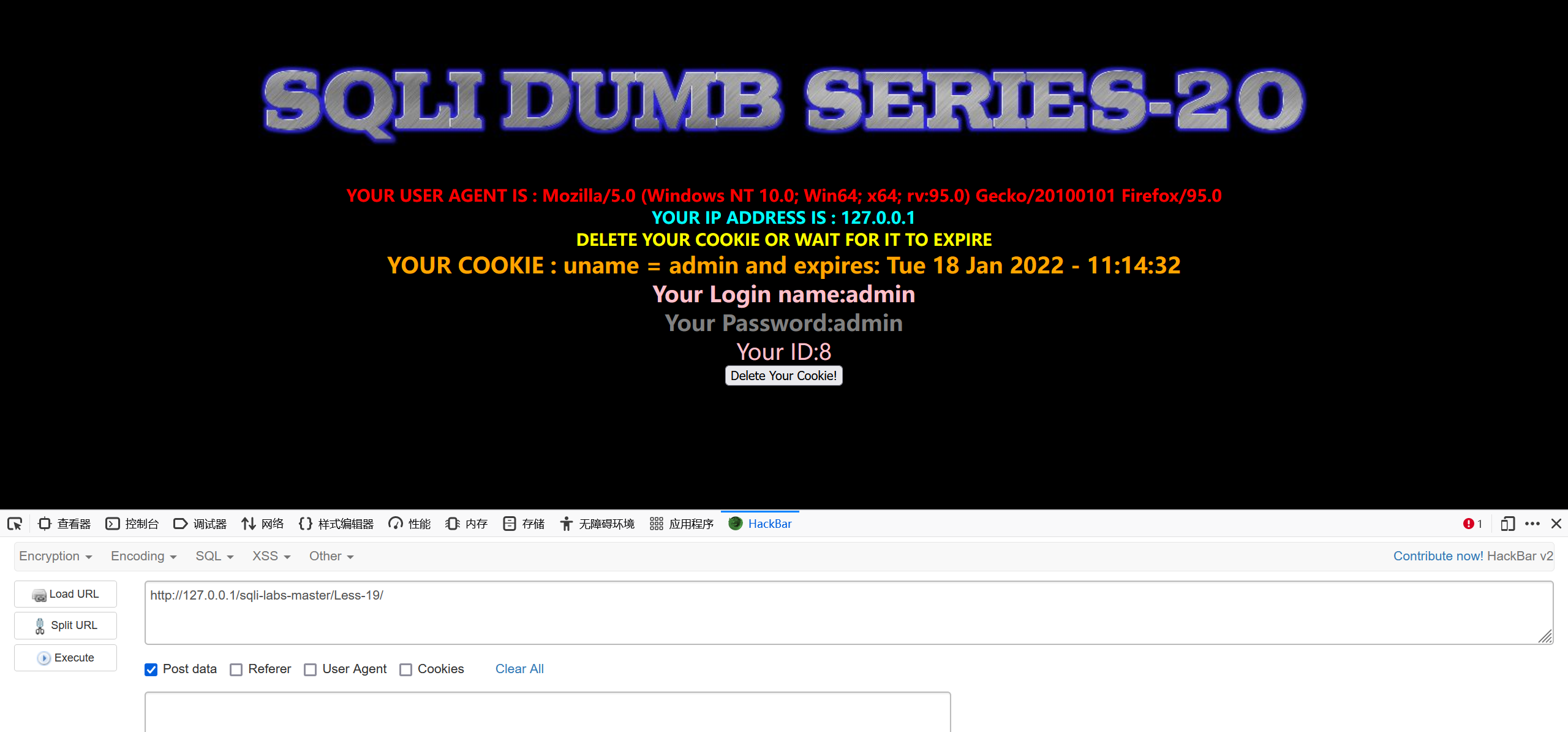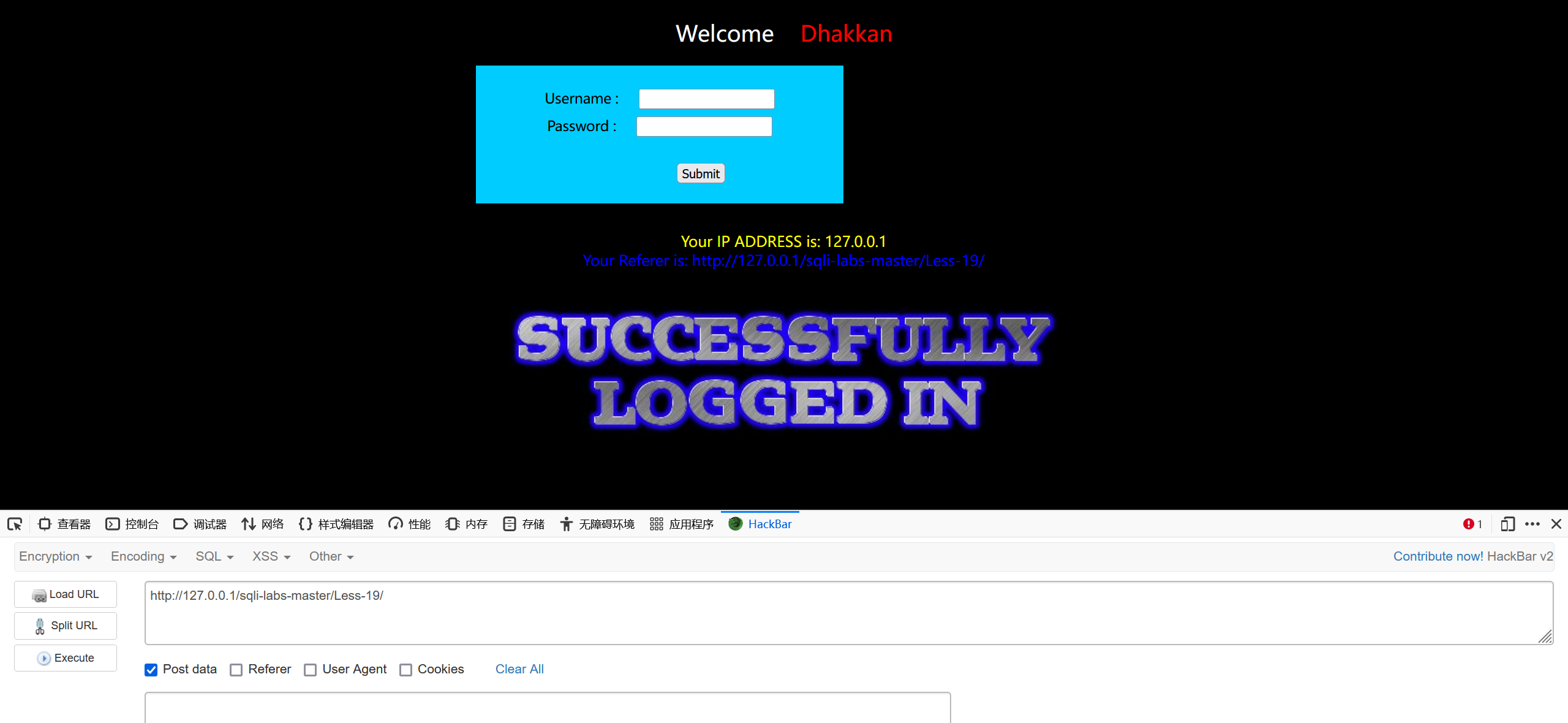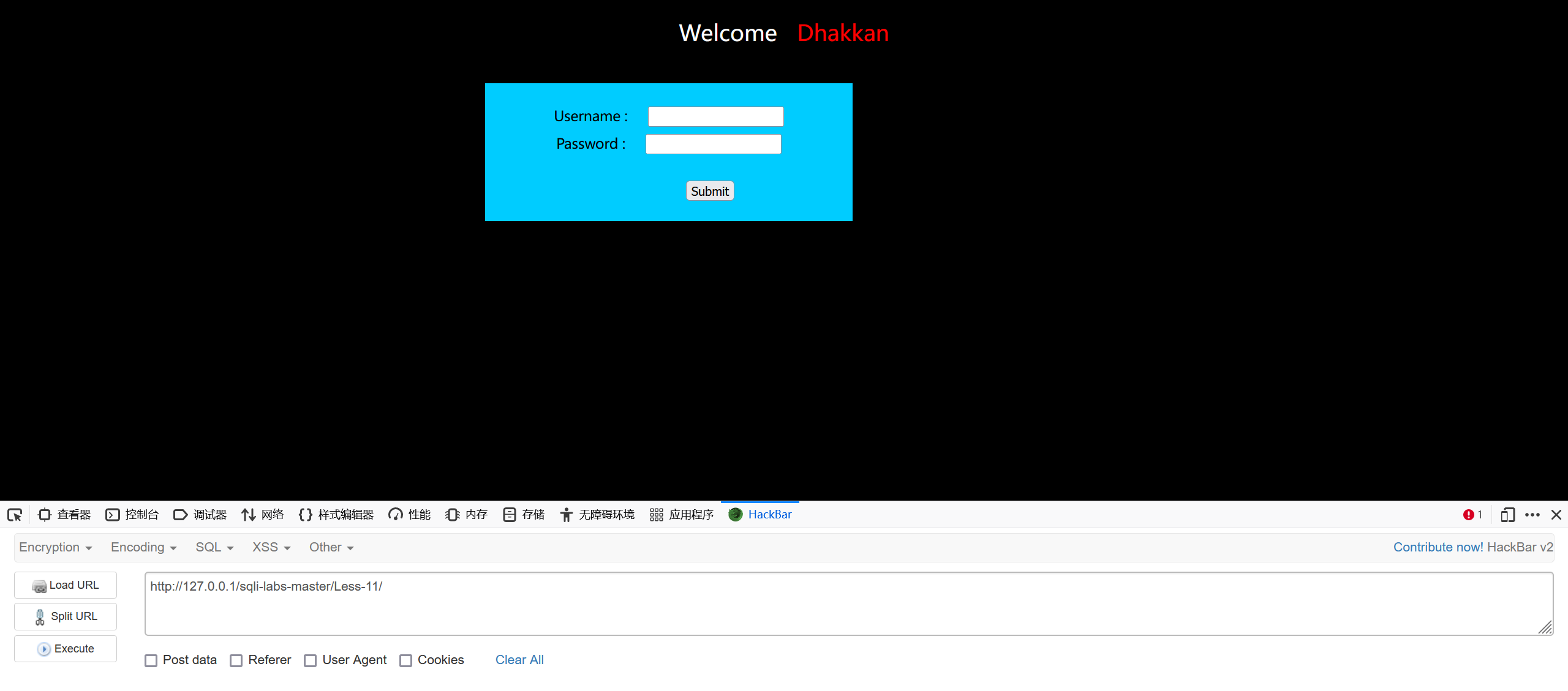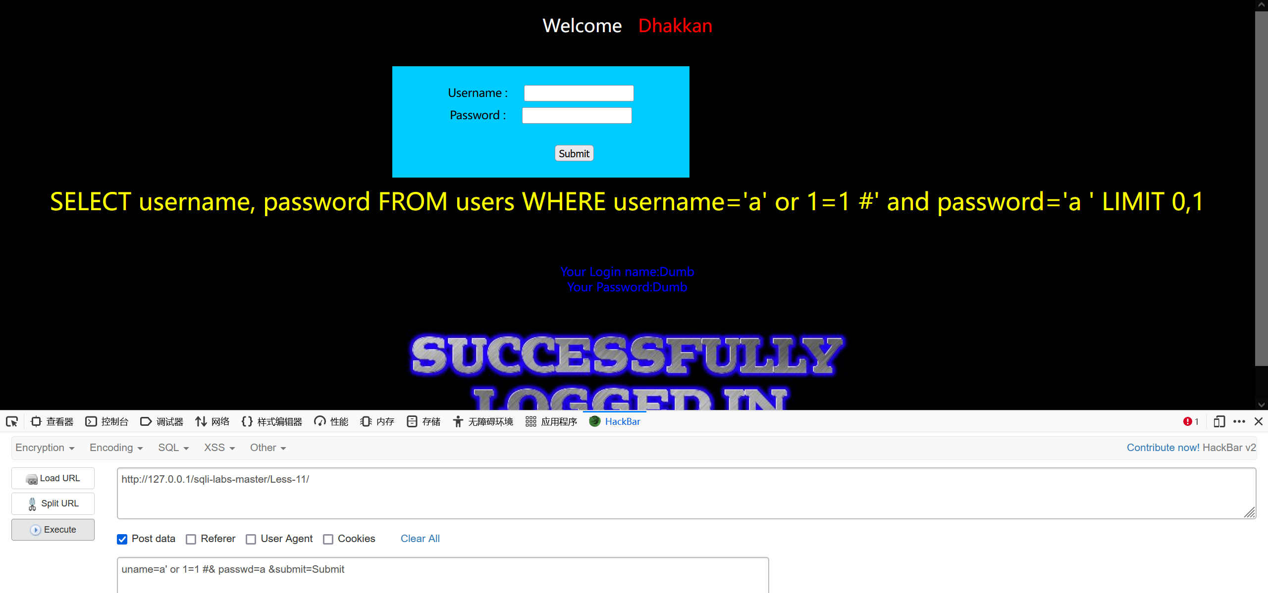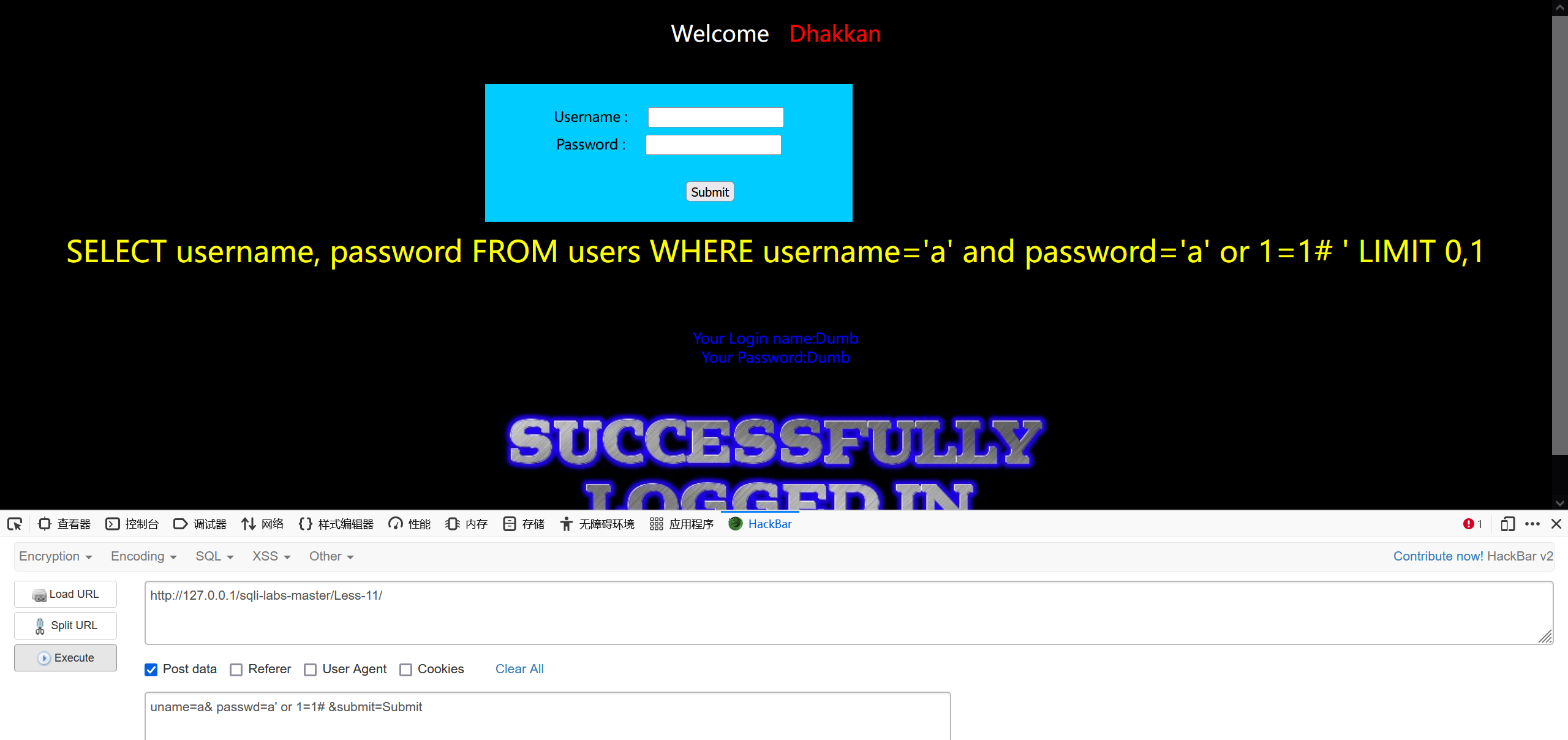 通过注入测试本关注入点为:uname=admin“ or 1=1# &passwd=a&submit=Submit