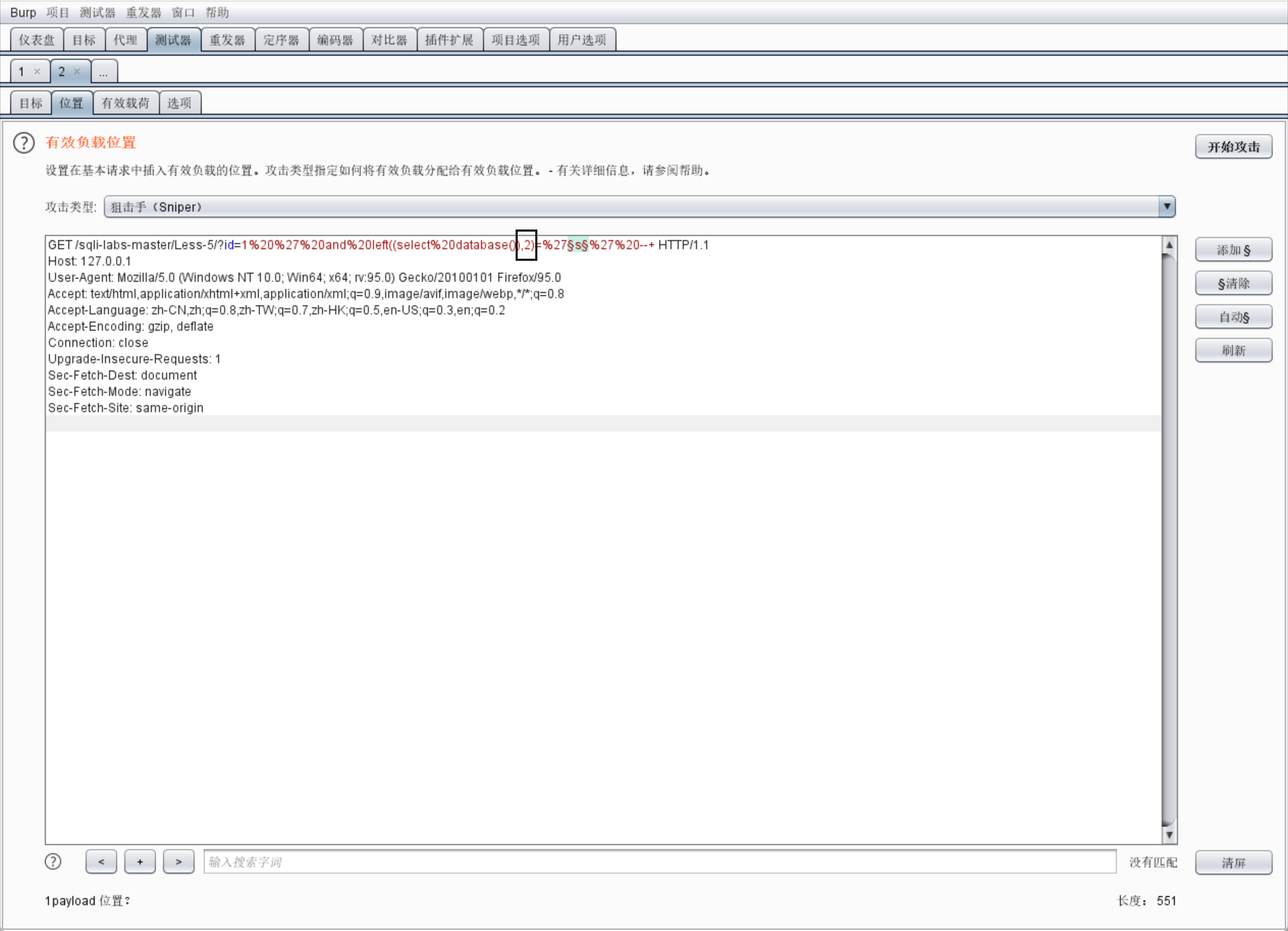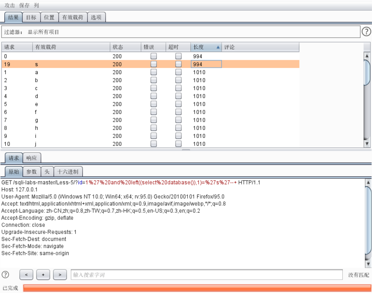 输入http://127.0.0.1/sqli-labs-master/Less-5/?id=1' and left((select database()),1)='s'--+: