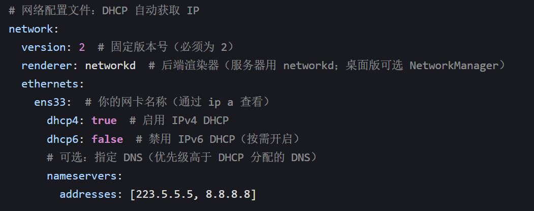 vim /etc/netplan/00-installer-config.yaml #打开Ubuntu网卡配置文件