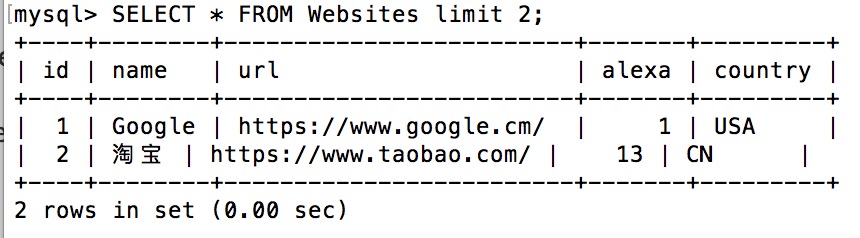 mysql> SELECT * FROM Websites; +----+---------------+---------------------------+-------+---------+ | id | name | url | alexa | country | +----+---------------+---------------------------+-------+---------+ | 1 | Google | https://www.google.cm/ | 1 | USA | | 2 | 淘宝 | https://www.taobao.com/ | 13 | CN | | 3 | 菜鸟教程 | http://www.runoob.com/ | 5000 | USA | | 4 | 微博 | http://weibo.com/ | 20 | CN | | 5 | Facebook | https://www.facebook.com/ | 3 | USA | | 7 | stackoverflow | http://stackoverflow.com/ | 0 | IND | +----+---------------+---------------------------+-------+---------+