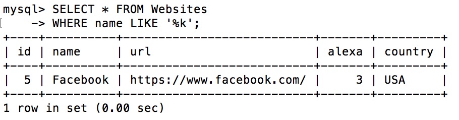 mysql> SELECT * FROM Websites; +----+---------------+---------------------------+-------+---------+ | id | name | url | alexa | country | +----+---------------+---------------------------+-------+---------+ | 1 | Google | https://www.google.cm/ | 1 | USA | | 2 | 淘宝 | https://www.taobao.com/ | 13 | CN | | 3 | 菜鸟教程 | http://www.runoob.com/ | 5000 | USA | | 4 | 微博 | http://weibo.com/ | 20 | CN | | 5 | Facebook | https://www.facebook.com/ | 3 | USA | | 7 | stackoverflow | http://stackoverflow.com/ | 0 | IND | +----+---------------+---------------------------+-------+---------+