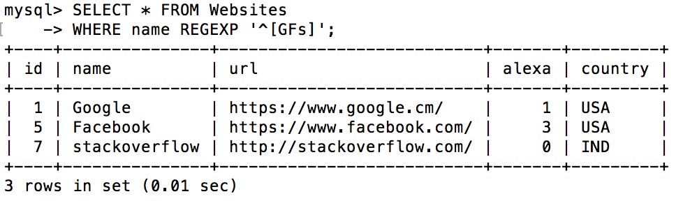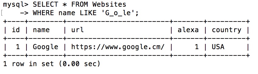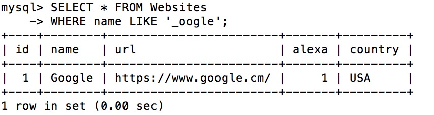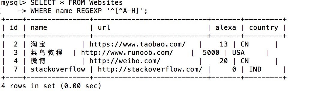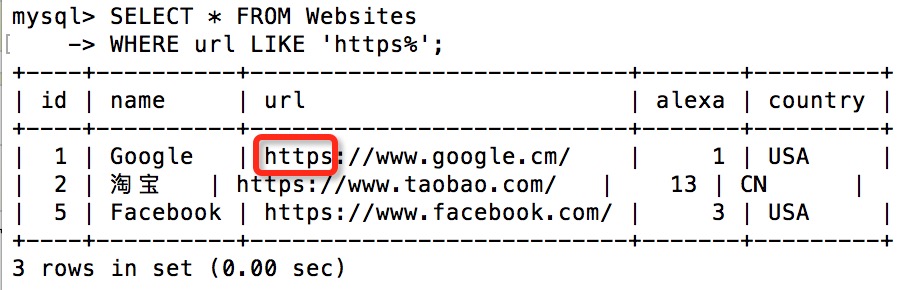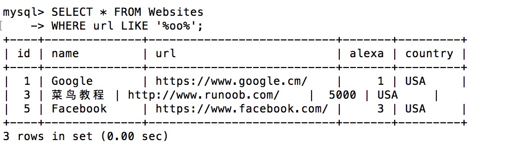mysql> SELECT * FROM Websites; +----+---------------+---------------------------+-------+---------+ | id | name | url | alexa | country | +----+---------------+---------------------------+-------+---------+ | 1 | Google | https://www.google.cm/ | 1 | USA | | 2 | 淘宝 | https://www.taobao.com/ | 13 | CN | | 3 | 菜鸟教程 | http://www.runoob.com/ | 5000 | USA | | 4 | 微博 | http://weibo.com/ | 20 | CN | | 5 | Facebook | https://www.facebook.com/ | 3 | USA | | 7 | stackoverflow | http://stackoverflow.com/ | 0 | IND | +----+---------------+---------------------------+-------+---------+