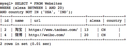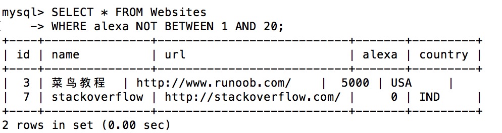 如需显示不在上面实例范围内的网站,请使用 NOT BETWEEN: