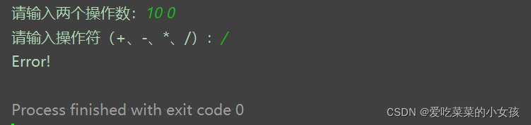 试编写一个根据用户输入的两个操作数和一个运算符( 只包含+、-、*、/ ),由计算机输出运算结果的程序。当操作数是除号("/")时,运算结果是整除的结果,如10/3=3;并且当除数为0时,输出“Error!”。操作数都是整数。